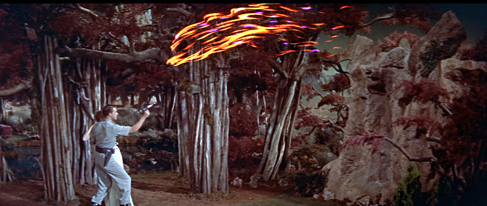 Leslie Nielsen’s Cmdr. Adams disintegrates a tiger with his sidearm blaster to protect Altaira when the previously friendly cat attacks without warning in this scene from the 1956 sci-fi classic