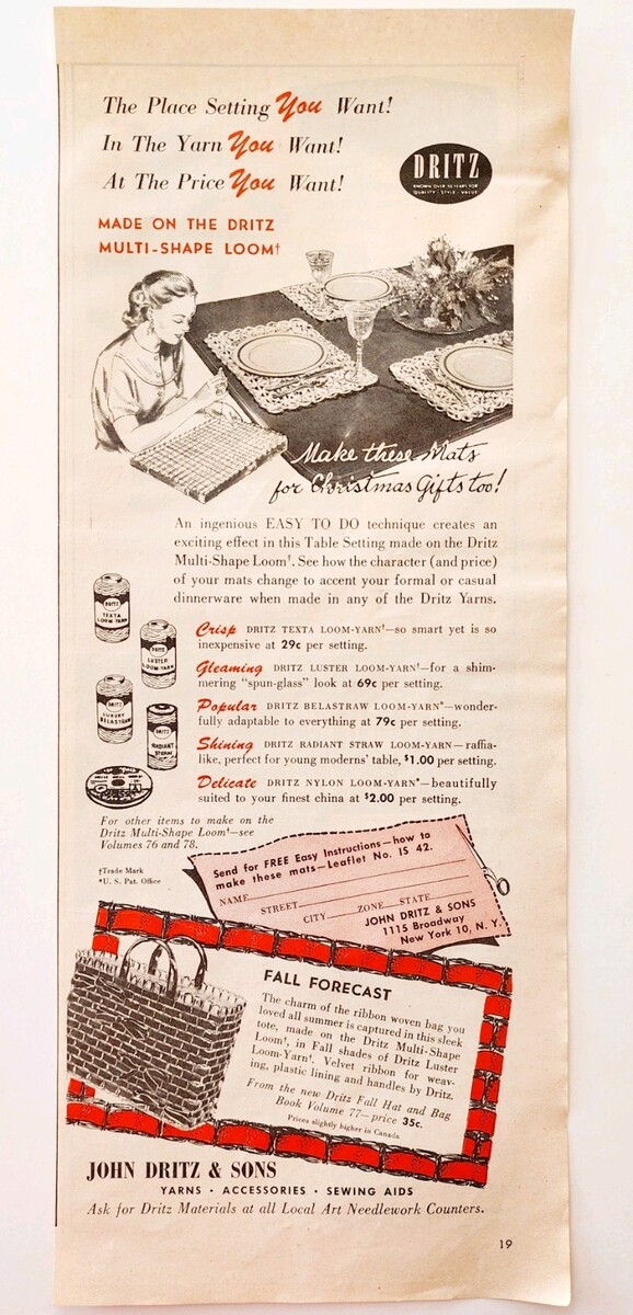 1957 John Dritz Yarns & Accessories Advertisement Crafts Sewing Supply DWJJ6