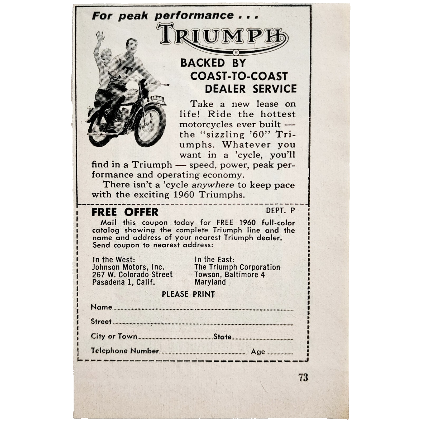 1960 Triumph Motorcycle Advertisement Transportation Bikes Vintage DWF26