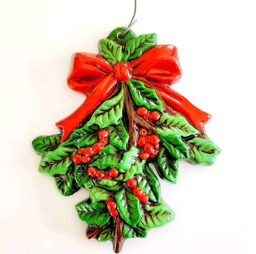 - 1960s Antique Christmas Ornament Ceramic Hand Painted Mistletoe Holly 1 E90C