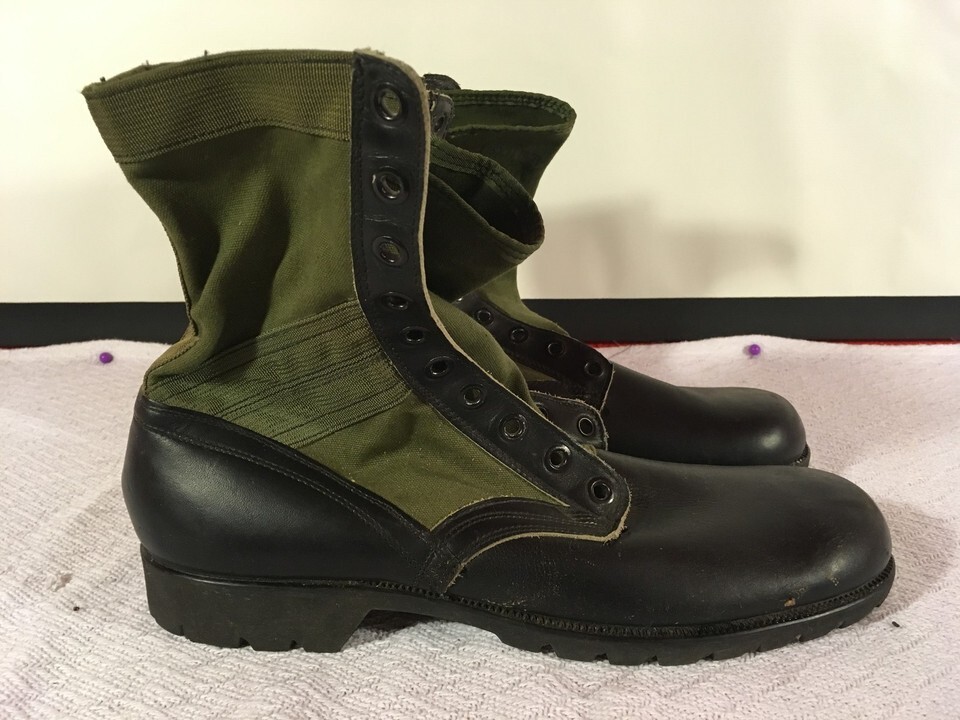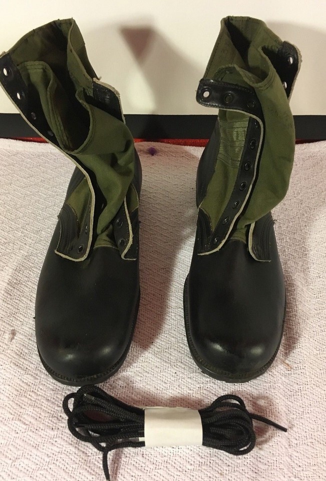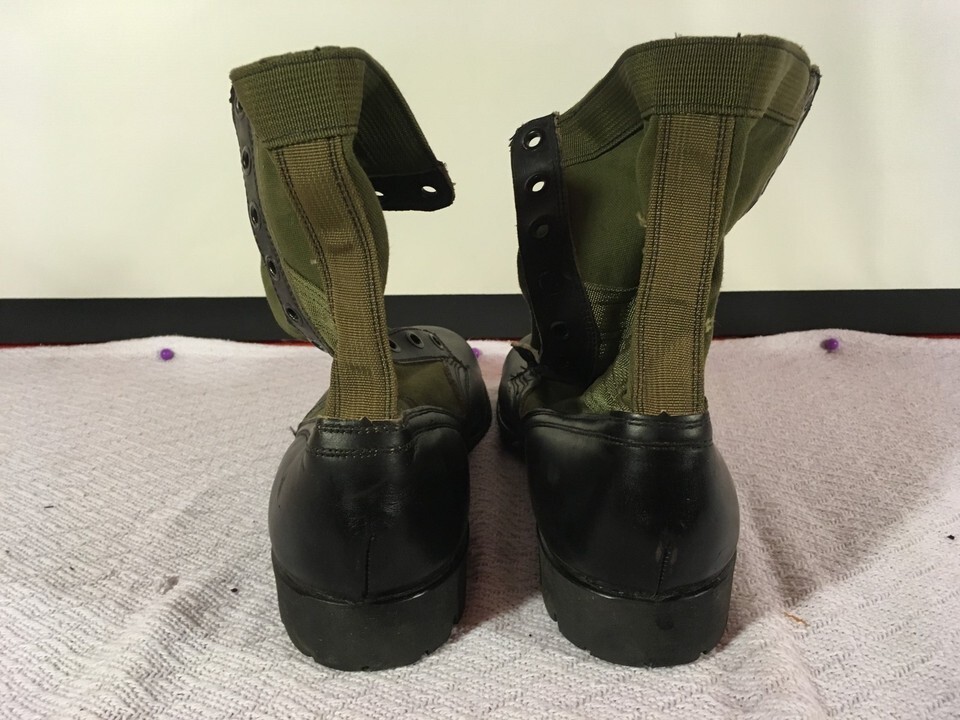 THERE IS SOME SCUFFING HERE AND THERE, PLEASE KNOW THAT THESE ARE THE ORIGINAL GREEN JUNGLE BOOTS USED DURING THE VIETNAM CONFLICT, OPERATION JUST CAUSE IN PANAMA, OPERATION URGENT FURY IN GRENADA, THEY HAVE BEEN IN A DUFFEL BAG OR IN A BOX IN A CLIMATE CONTROLLED STORAGE UNIT FOR OVER 55 YEARS, THEY ARE NOT IN PERFECT CONDITION, THEY ARE NEW OLD STOCK. AS A FELLOW VETERAN YOU KNOW THE BEST WAY TO MAKE SCUFFS GO AWAY AND THATS WITH GOOD OLD BLACK SHOE POLISH AND HOT WATER , THE SOLES ARE 100 PERCENT AND READY FOR A 20K MARCH. AGAIN THESE ARE NEW AND THE ORIGINAL 1963- 1968 ISSUED GREEN HOT WEATHER JUNGLE BOOT. PLEASE TAKE A LOOK AT MY PICTURES AND KNOW YOU ARE GETTING THE REAL DEAL.