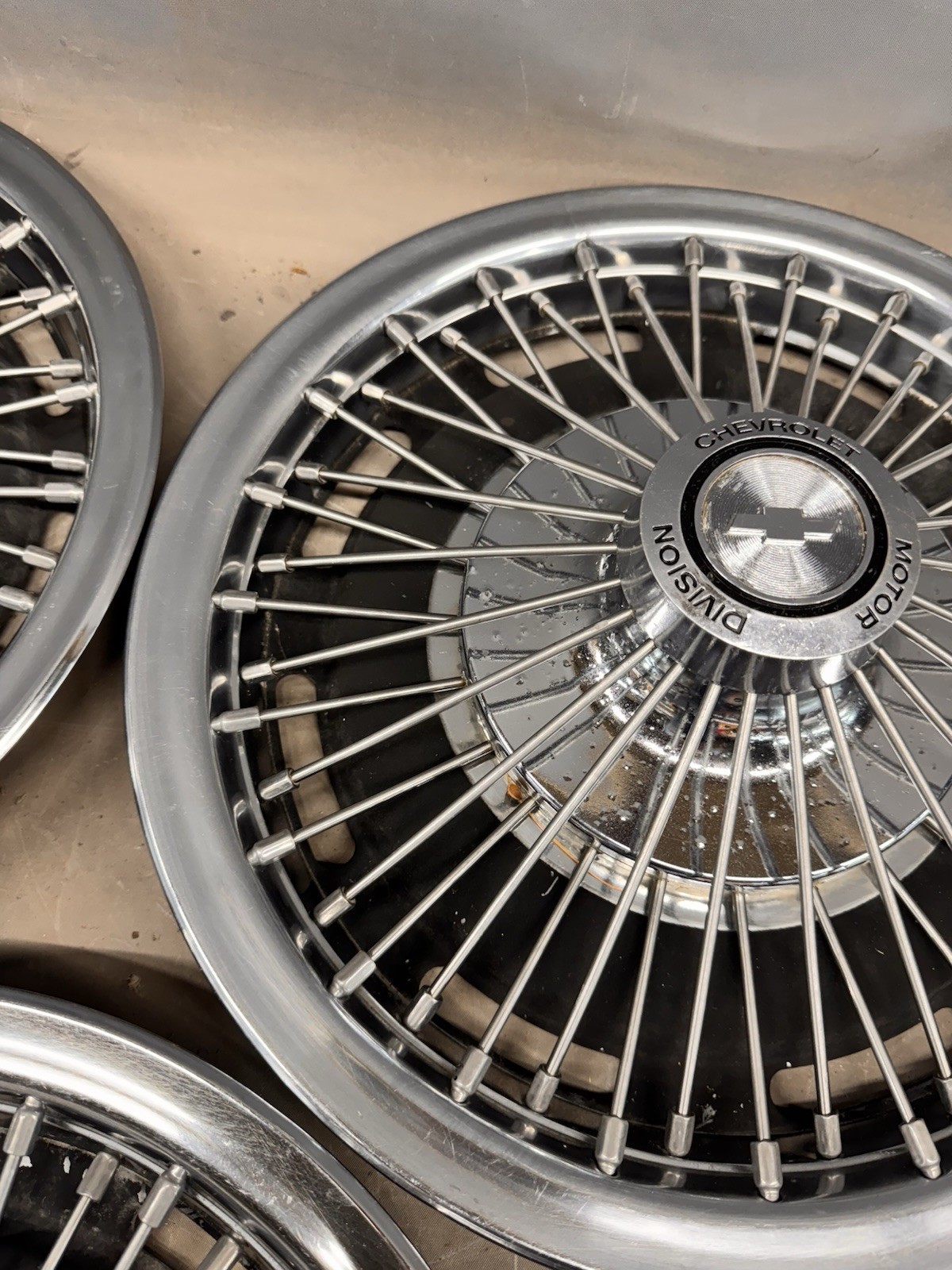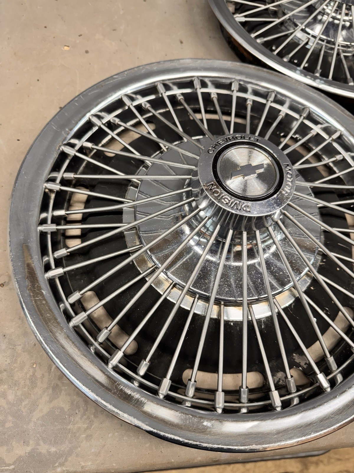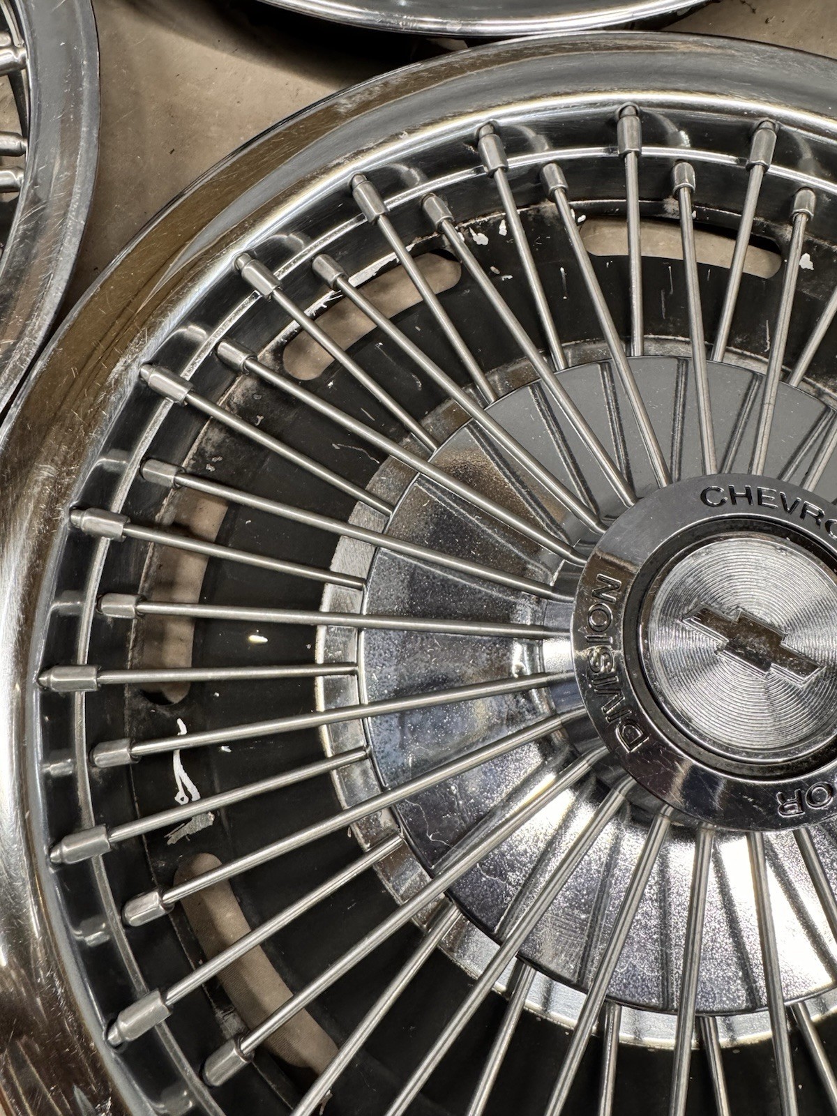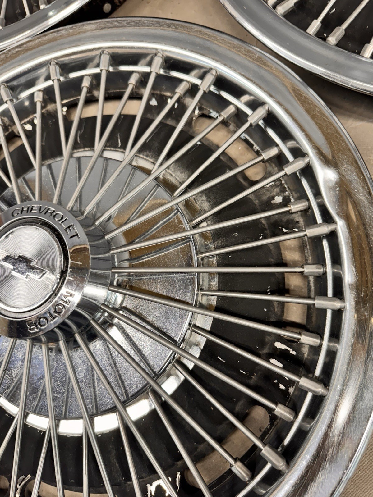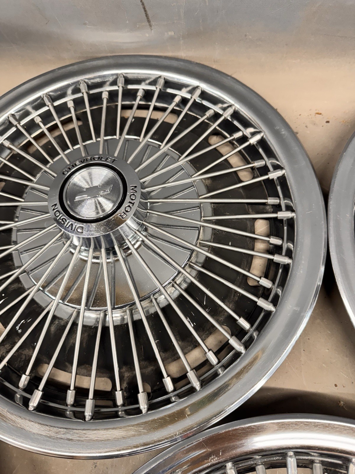 Incredibly nice clean original factory wire hubcaps with center caps. These were used on multiple 1964-1969 Chevrolet passenger cars