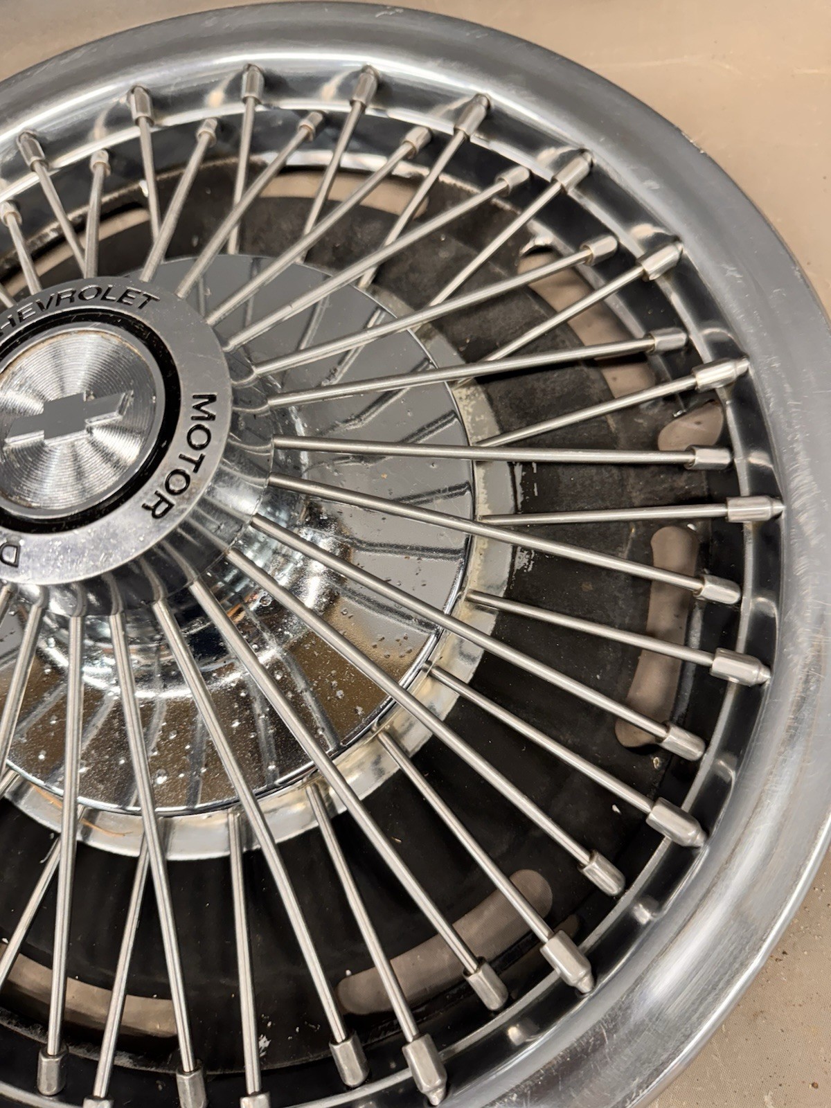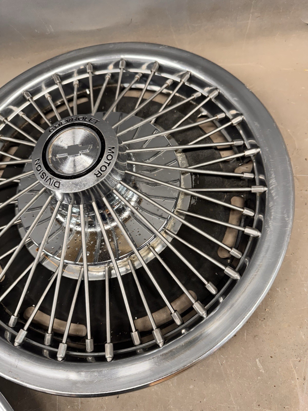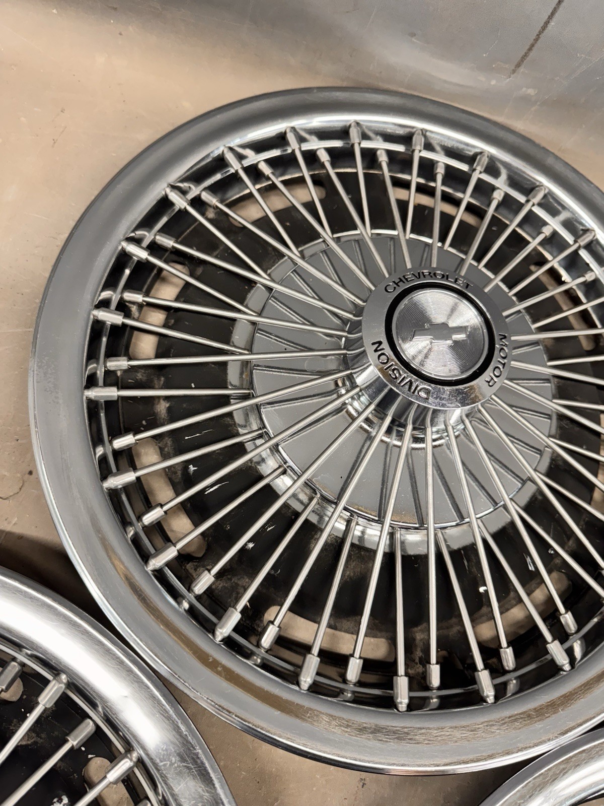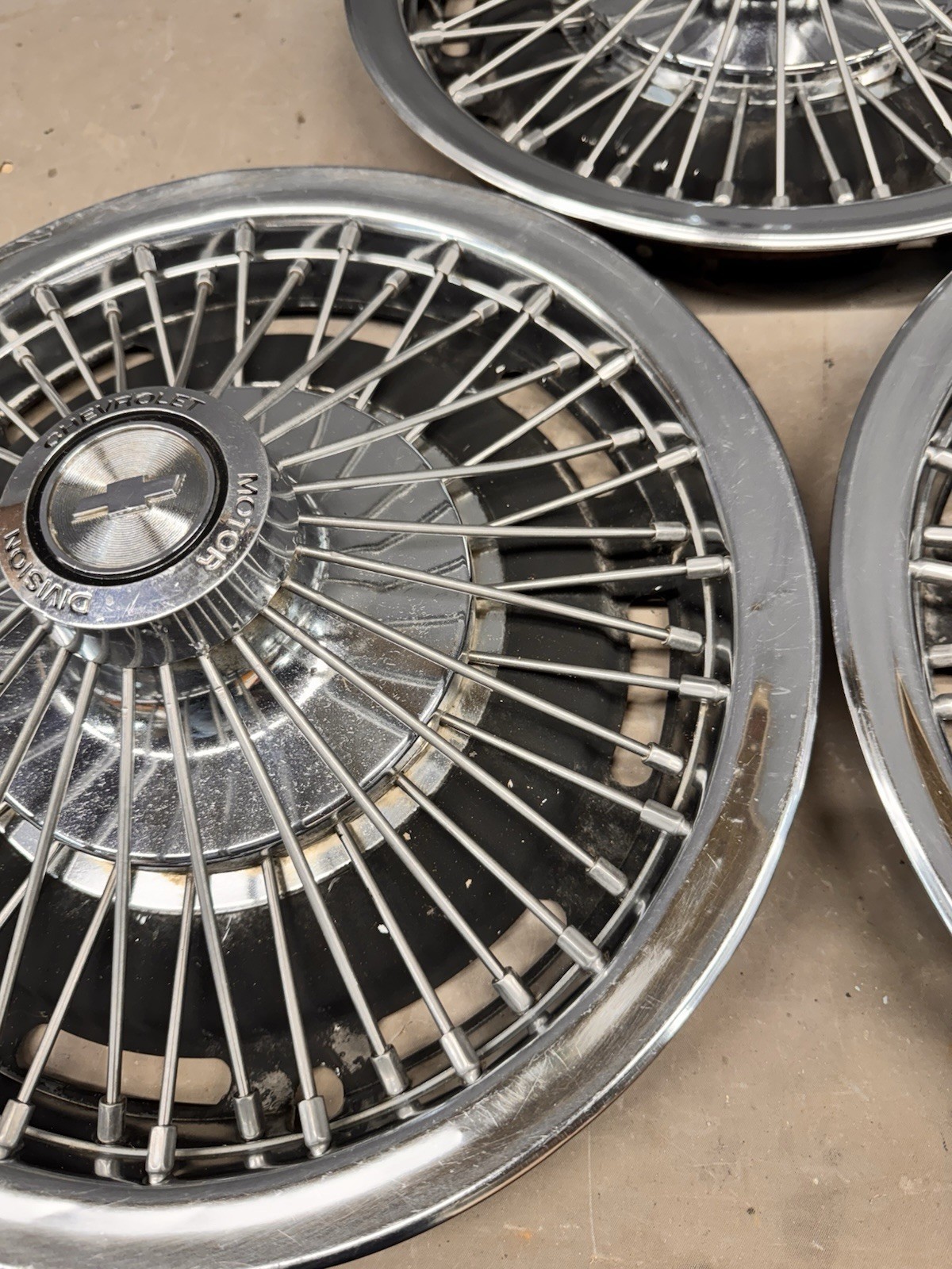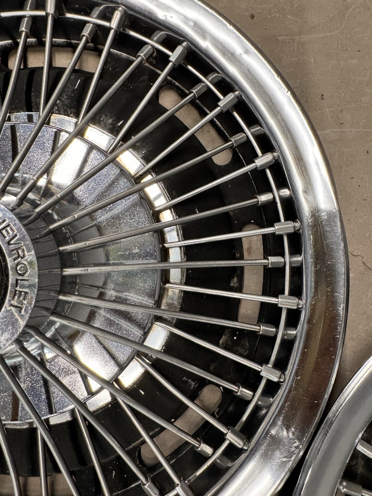 Incredibly nice clean original factory wire hubcaps with center caps. These were used on multiple 1964-1969 Chevrolet passenger cars