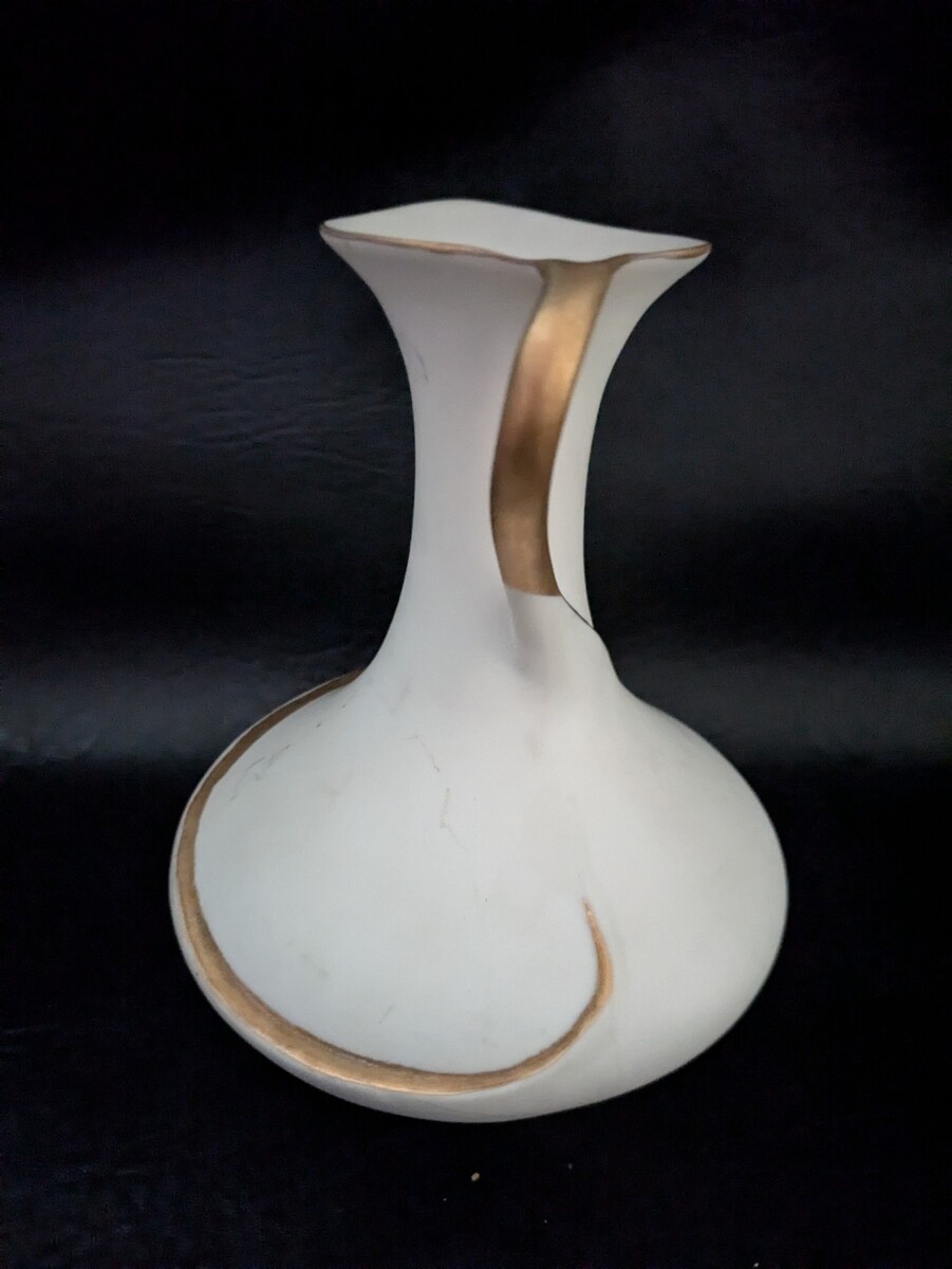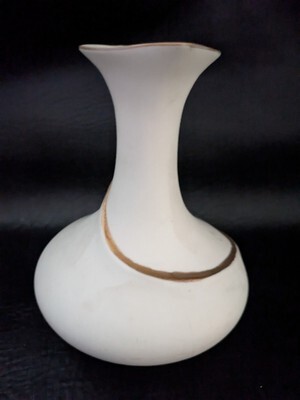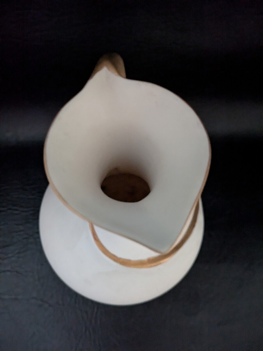- 1964 Vallona Starr California Pottery Pitcher Vase Ewer White Gold 6.5 In Tall