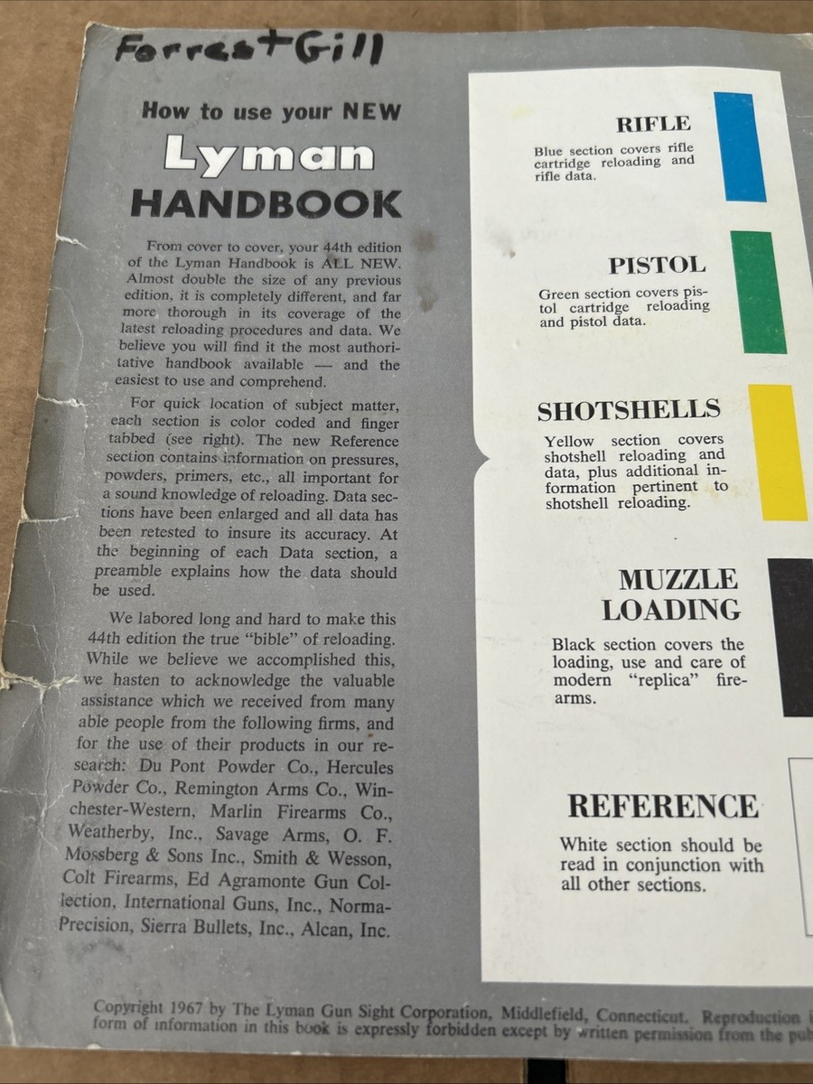 - 1967 LYMAN RELOADING HANDBOOK FOR SHOTSHELL, RIFLE, PISTOL, MUZZLE LOADING