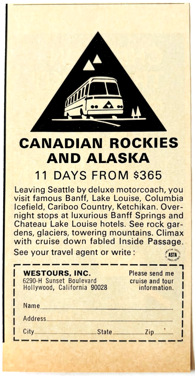 - 1967 Westours Bus Lines Advertisement Vintage Canadian Rockies & Alaska F6M