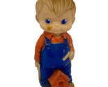 This cute little boy with the birdhouse is dressed in blue overalls with a pink shirt. He holds a square and a saw and the birdhouse sits between his feet. Marked 1968, J L Prescott Co. The squeaker is missing otherwise very good used condition, from a smoke free and pet free home. He is 8.5" tall