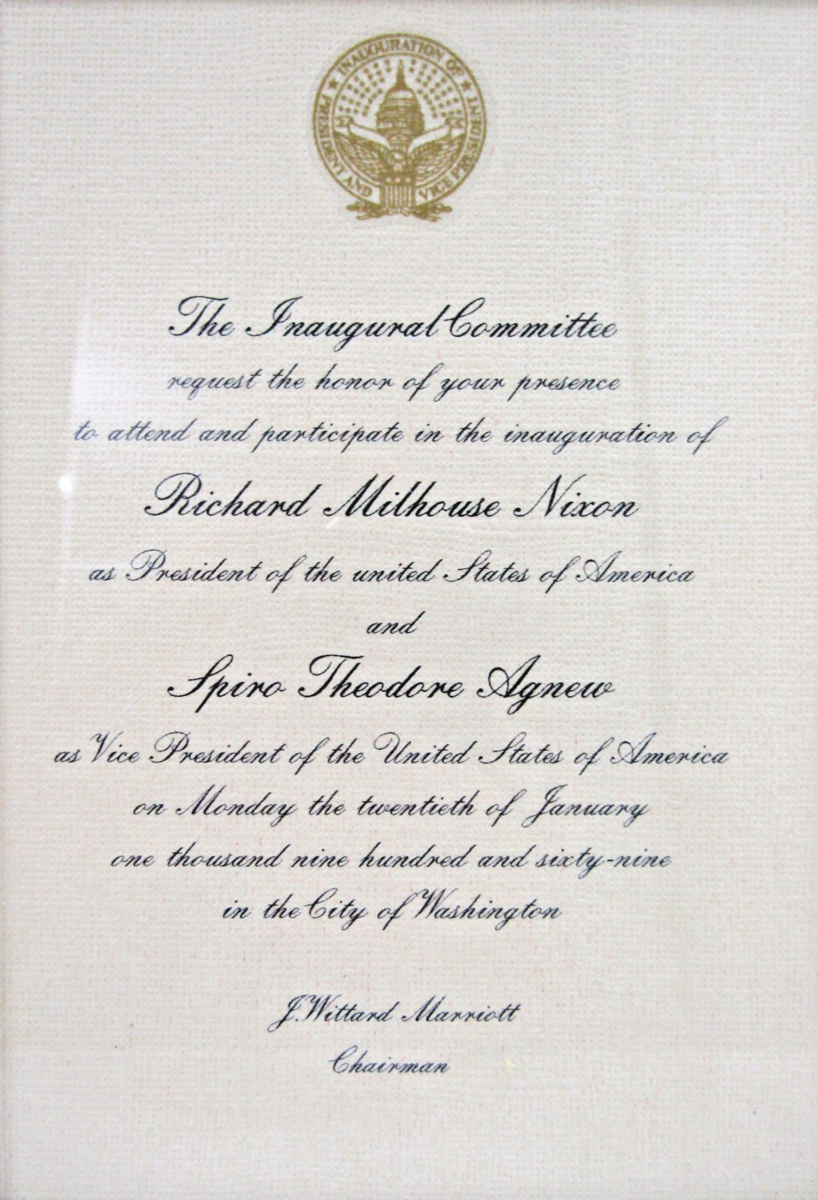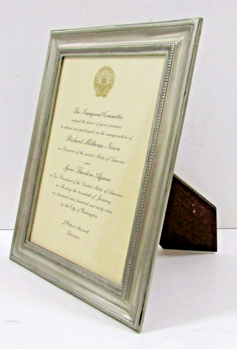 The product is a unique historical memorabilia item from the 1969 inauguration of President Nixon. The invitation is in an Italian Cosi Tabellini 95 Pewter Match frame featuring the name of the president and the theme of politics. This collectible piece serves as a rare and special memento of a significant event in American political history, making it a valuable addition to any collection related to U.S. presidents and historical memorabilia.