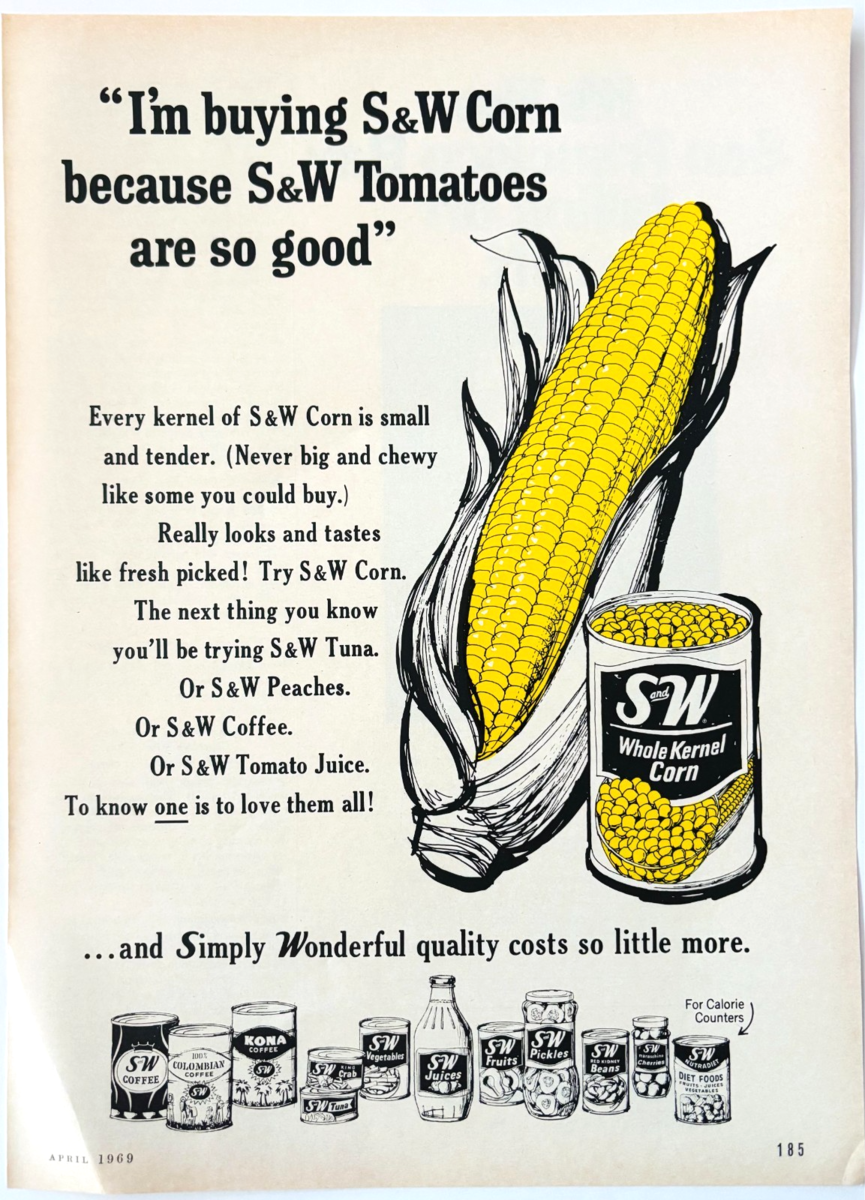 - 1969 Simply Wonderful Corn Advertisement S&W Canned Vegetables Foods DWW10C