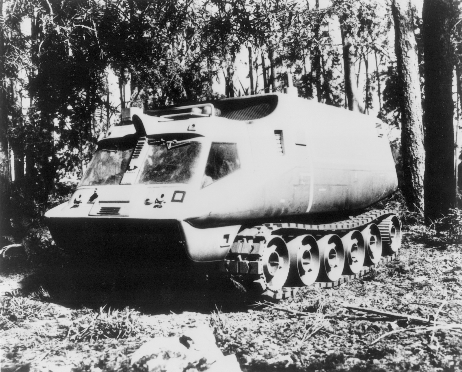 The fourth and final Earth line of defense are ground units like this armed Mobile which is on the move from a forest position in this scene from the 1970-71 alien invasion sci-fi TV series.