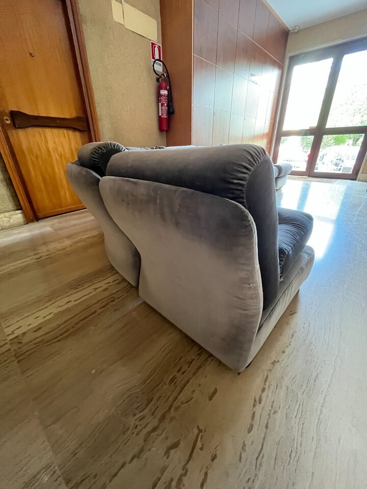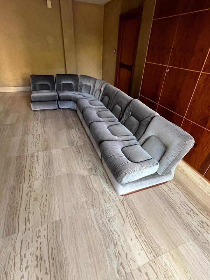 Integro e in buone condizioni, e composto da un divano tre posti, da uno angolare 2 posti e da 2 poltrone singole.I singoli si possono utilizzare da soli o accostare per formare la combinazione che potete ammirare nelle fotografie descrittive.Piccoli segni del tempo.Rivestimento in velluto.Colore carta da zucchero.Larghezza poltrona cm 60.Larghezza 3 posti cm 176.Larghezza angolare cm 198.Profondita cm 90.Altezza cm 75, altezza seduta cm 40.