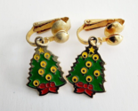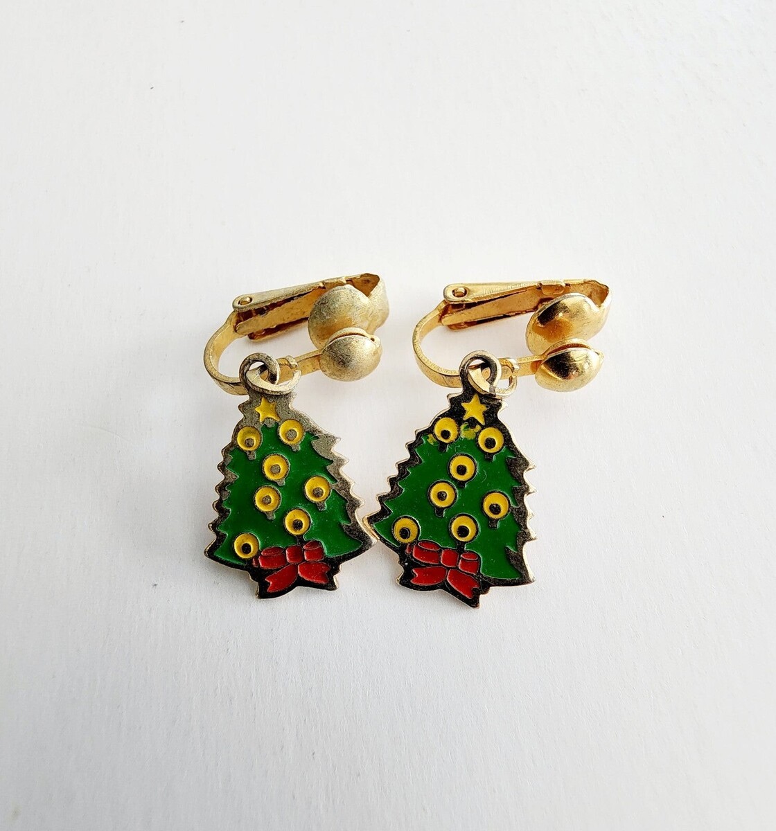 - 1970s Vintage Clip On Earrings Christmas Trees Enamel Metal Holiday Jewelry