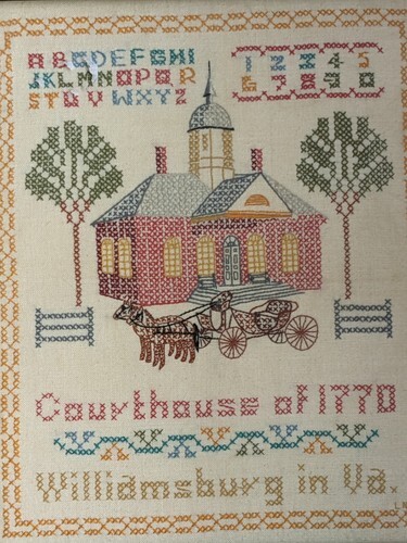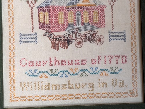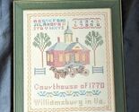 A vendre est un echantillonneur de point de croix d'occasion encadre et termine Colonial 1770 Williamsburg VA Court House.