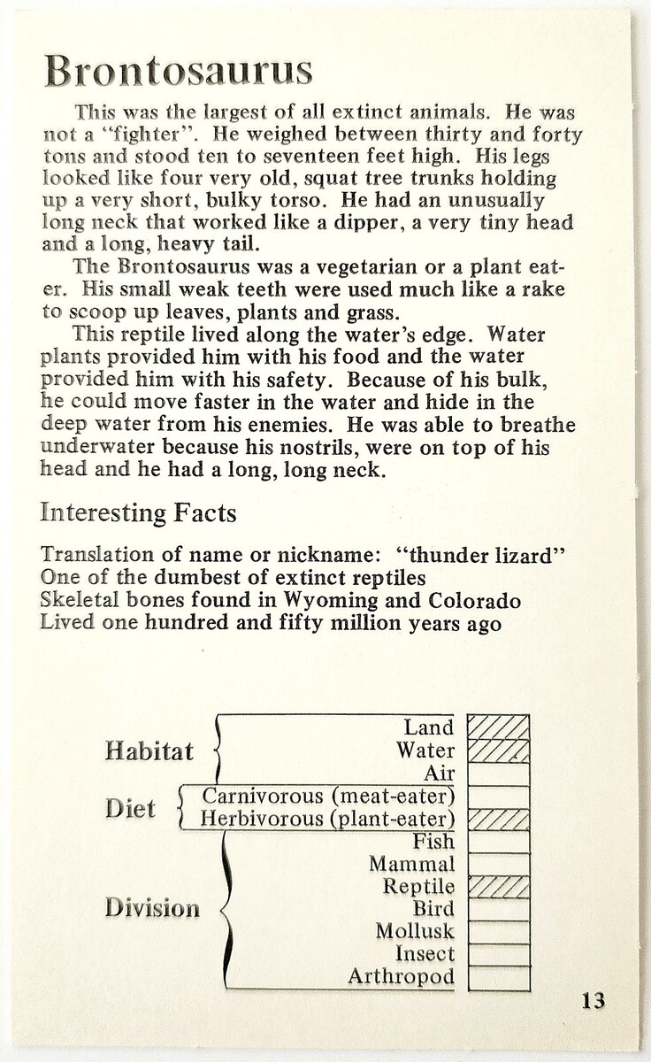 - 1975 BRONTOSAURUS Dinosaur Card Vintage Prehistoric Illustration Ephemera B78A