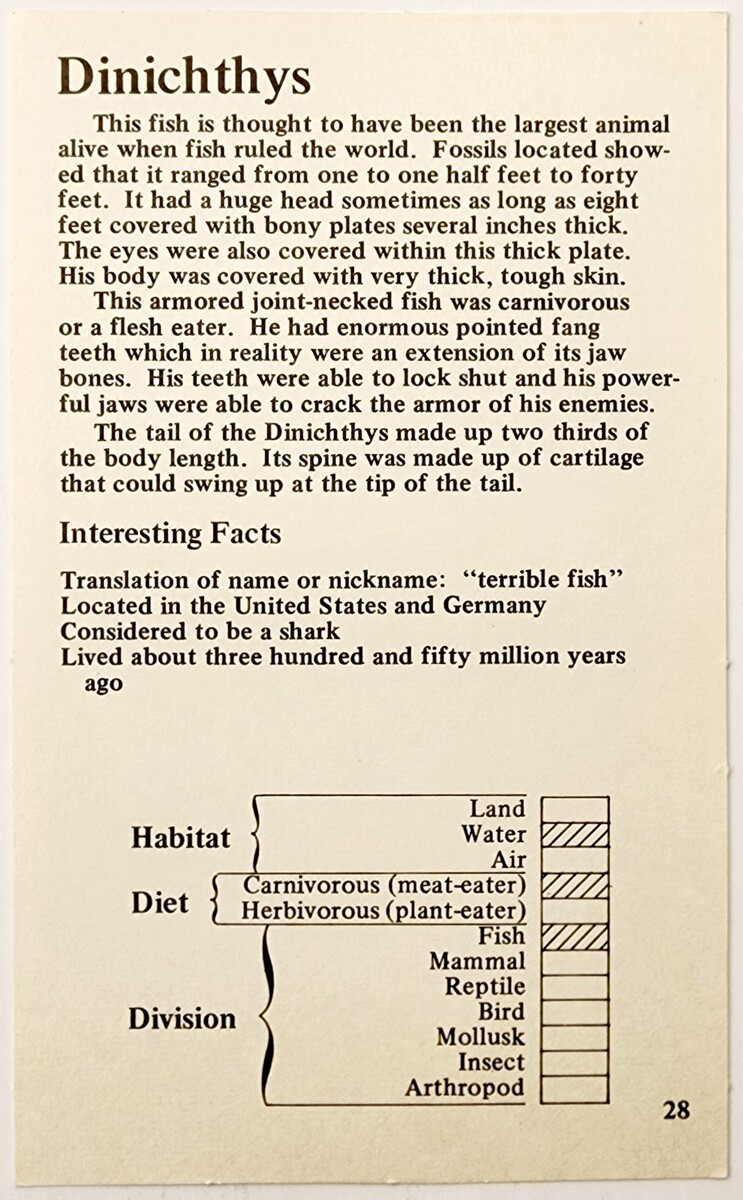 1975 DINICHTHYS Dinosaur Card Vintage Prehistoric Illustration Ephemera B78B
