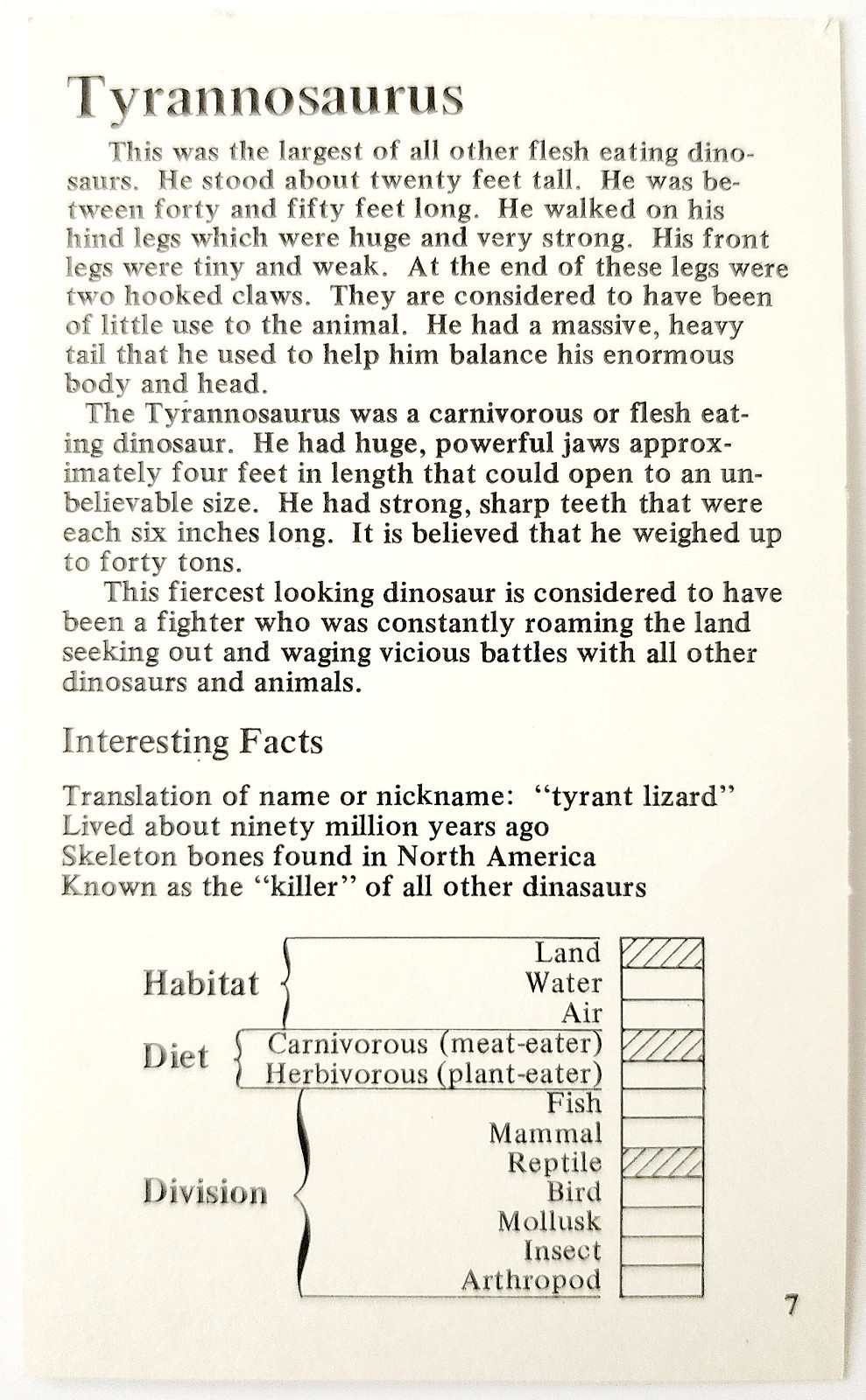 1975 TYRANNOSAURUS REX T-Rex Dinosaur Card Vintage Prehistoric Illustration B78A