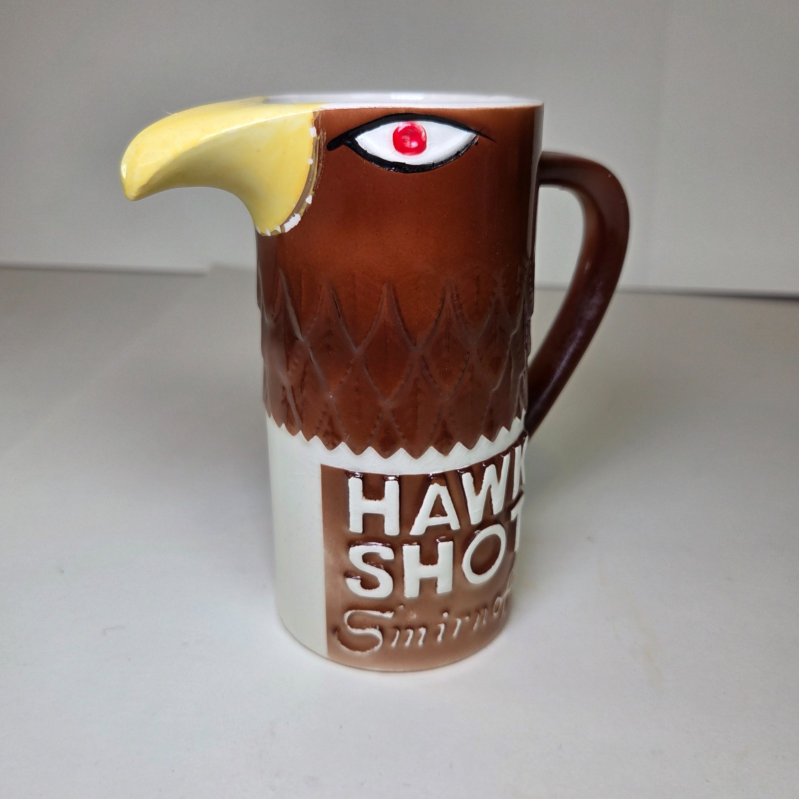 Add a bold piece to your vintage barware collection with this 1976 Smirnoff Hawk Shot mug. Crafted in ceramic by McCoy, this eagle-shaped pitcher features a raised "HAWK SHOT Smirnoff" design, sculpted feathers, and a beak-shaped spout. The bottom includes the original Hawk Shot cocktail recipe. A true standout for collectors or retro home bars.
