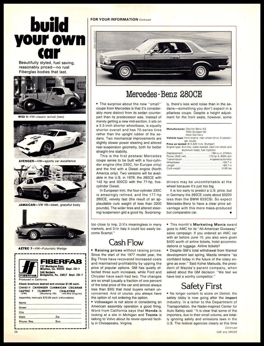 1977 Magazine Spec Test Sheet with Photo - Mercedes Benz 280CE A6