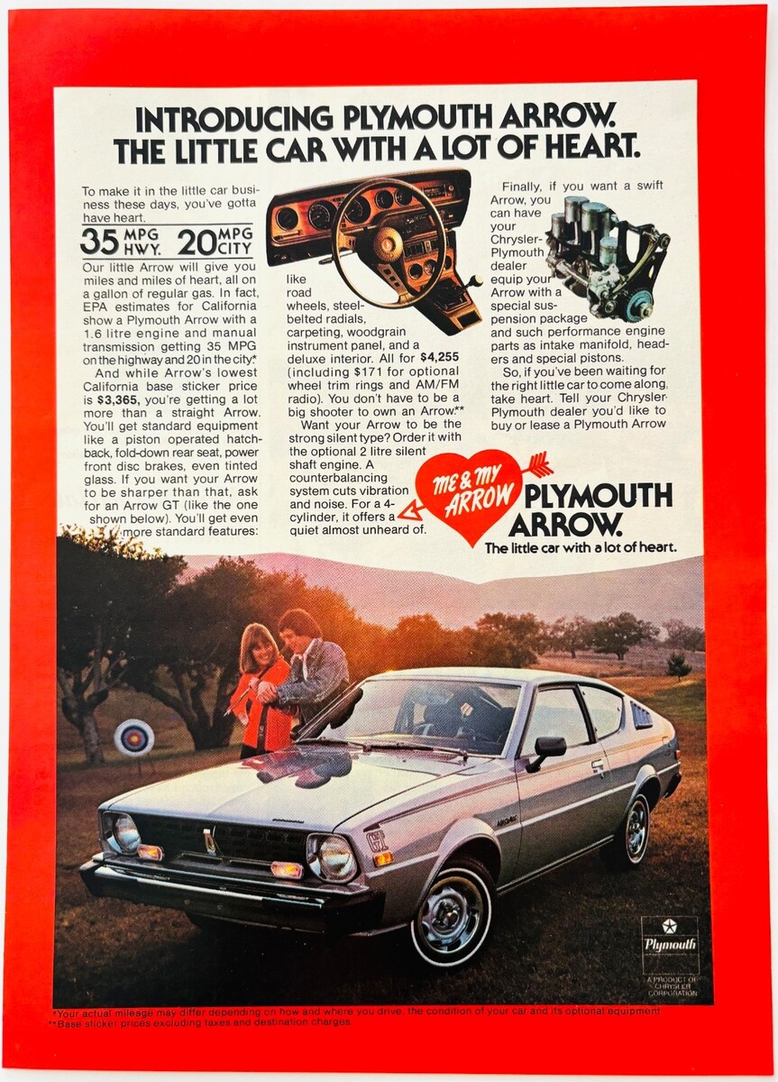 - 1977 Plymouth Arrow Advertisement Vintage Automobilia Classic GT Chrysler DWW13B