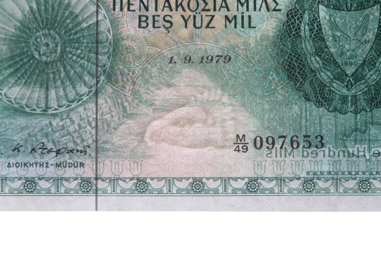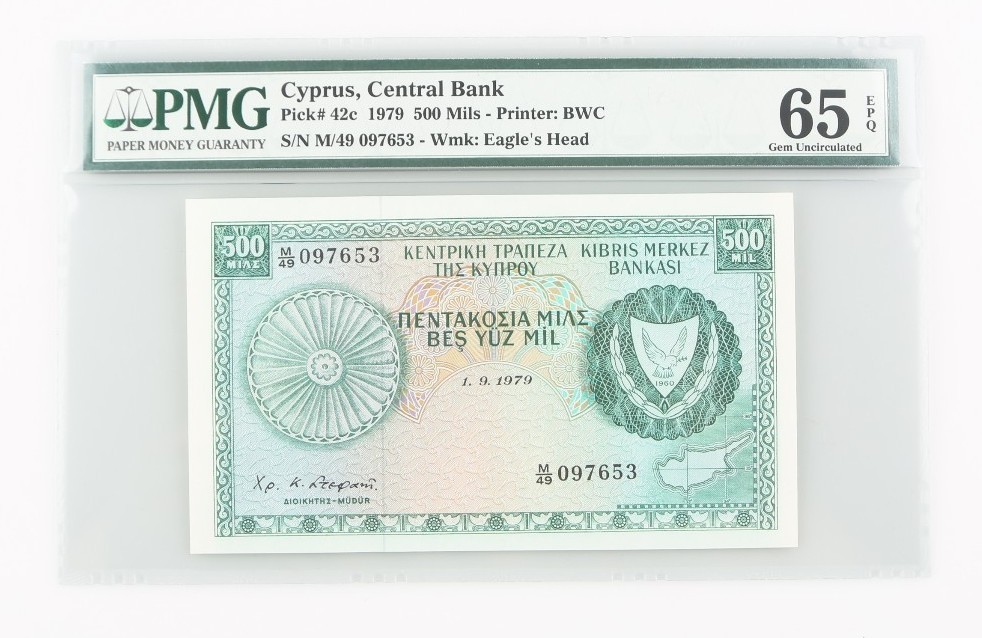Scelle dans un support PMG avec le titre "Chypre, Banque centrale // Pick # 42C 1979 500 mils - Imprimante: BWC // S / NM / 49 097653 - WMK: Eagle's Head"