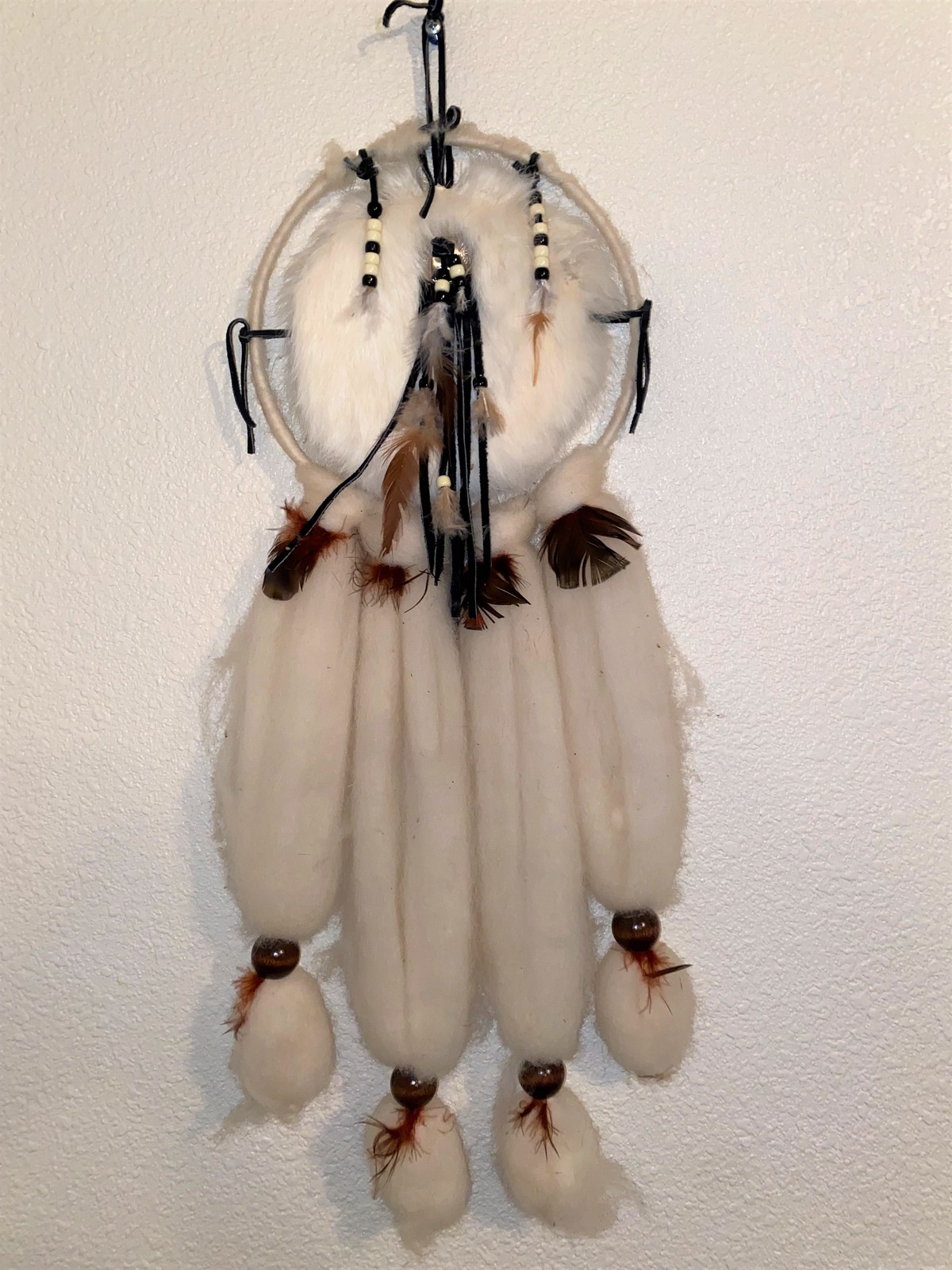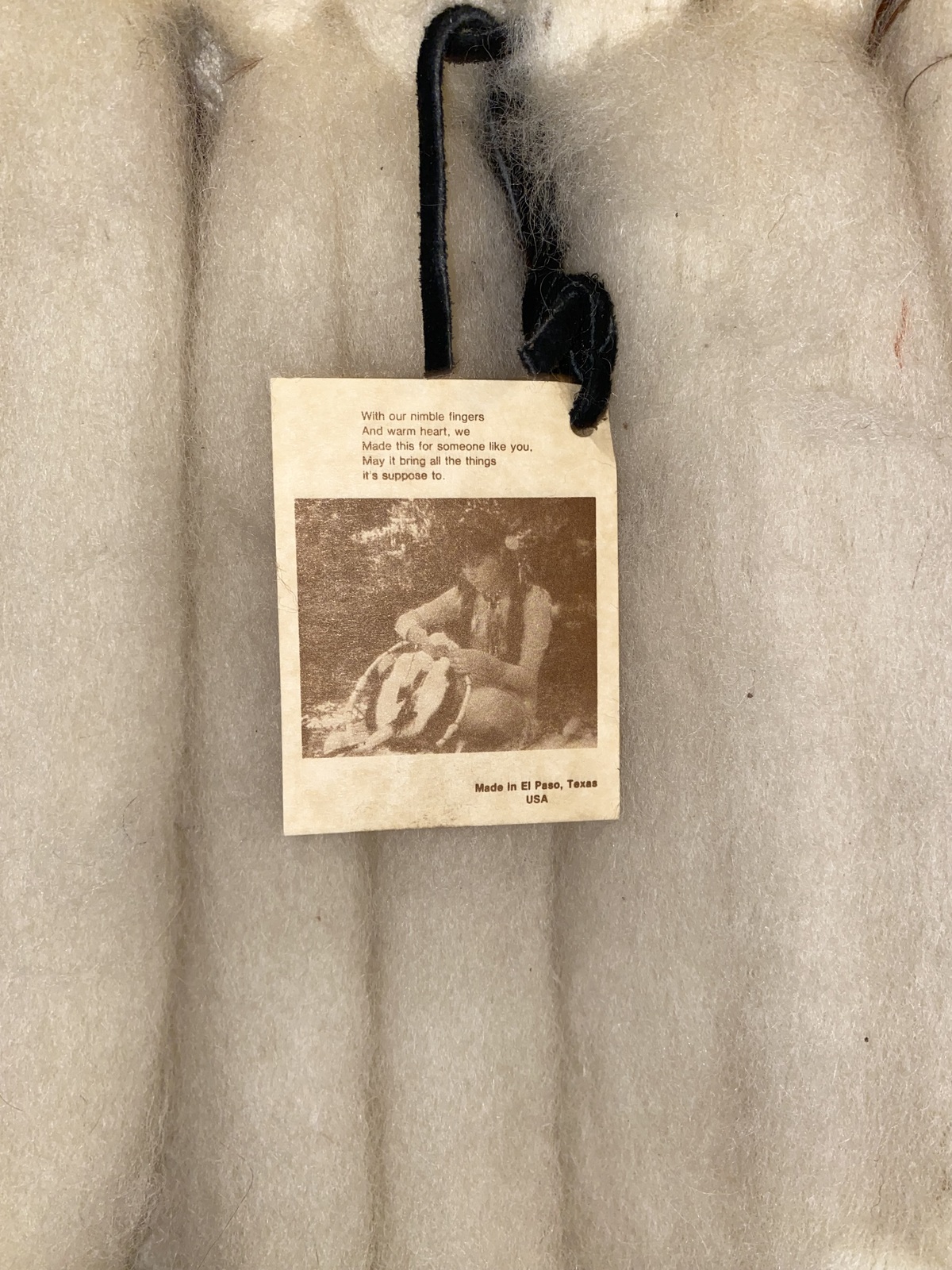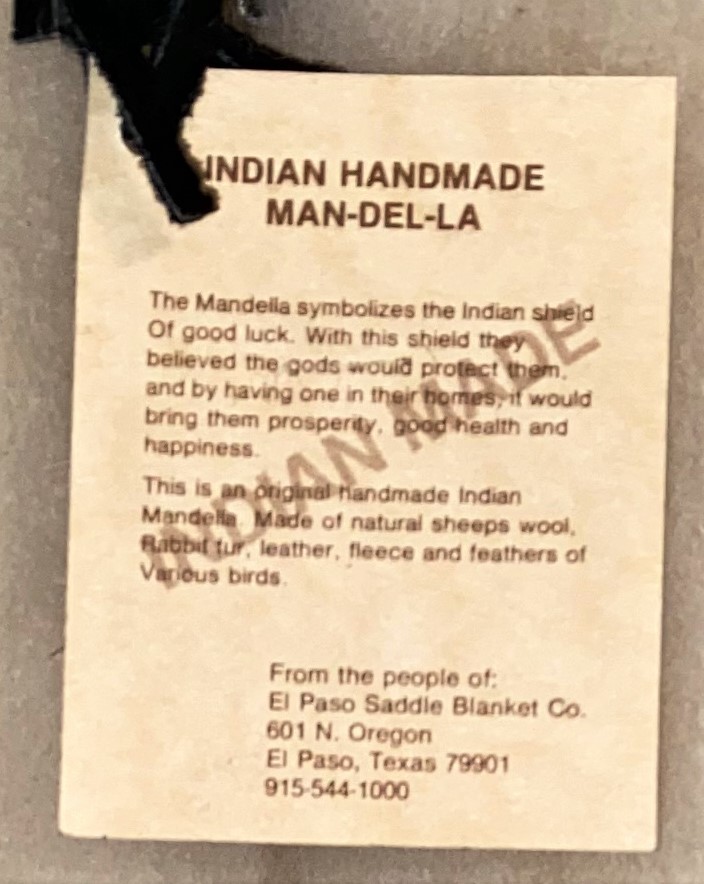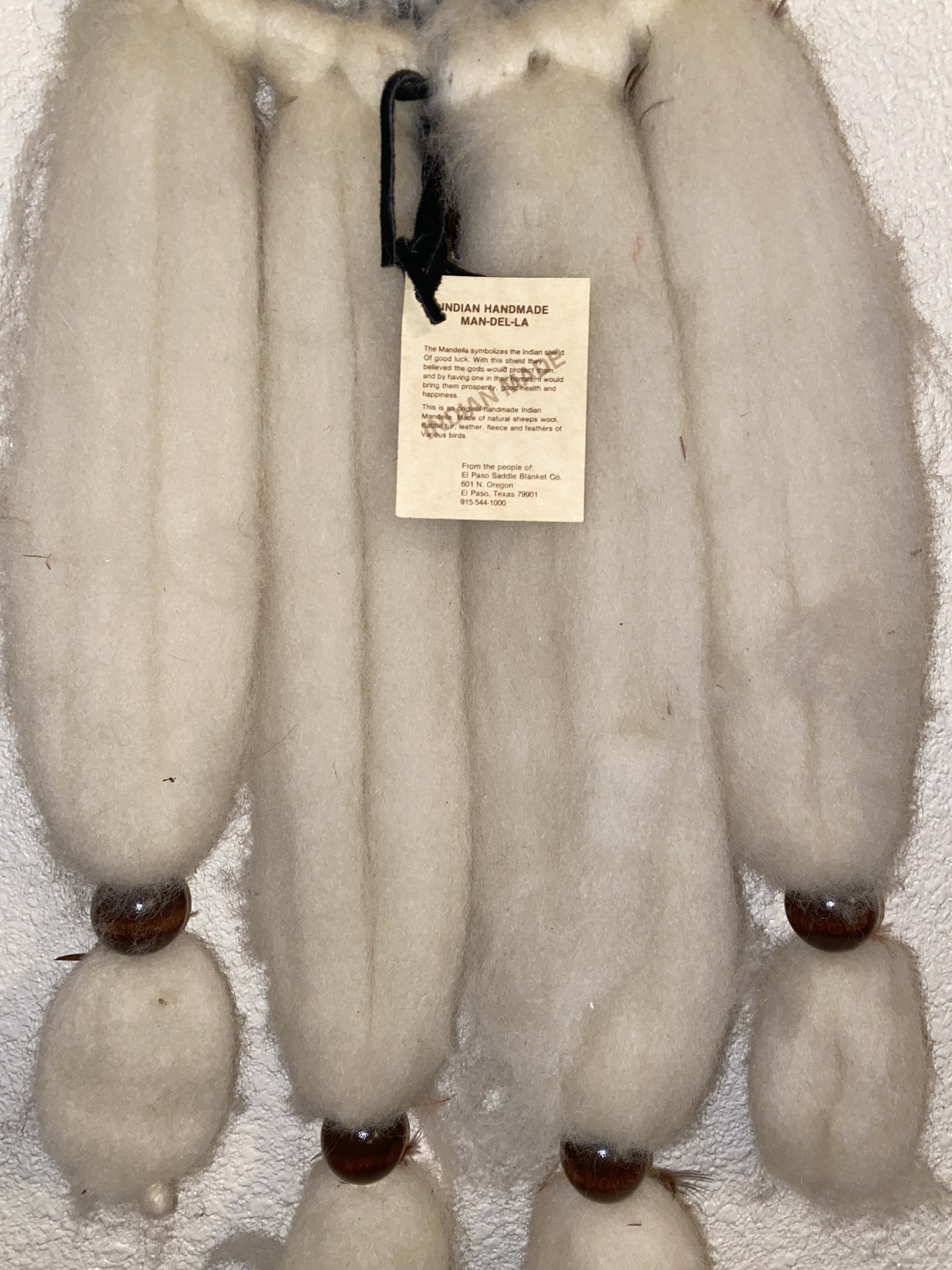 Additionally it says; This is an original handmade Indian Mandella Made from natural sheep's wool, Rabbit fur, leather, fleece and feathers of various birds.