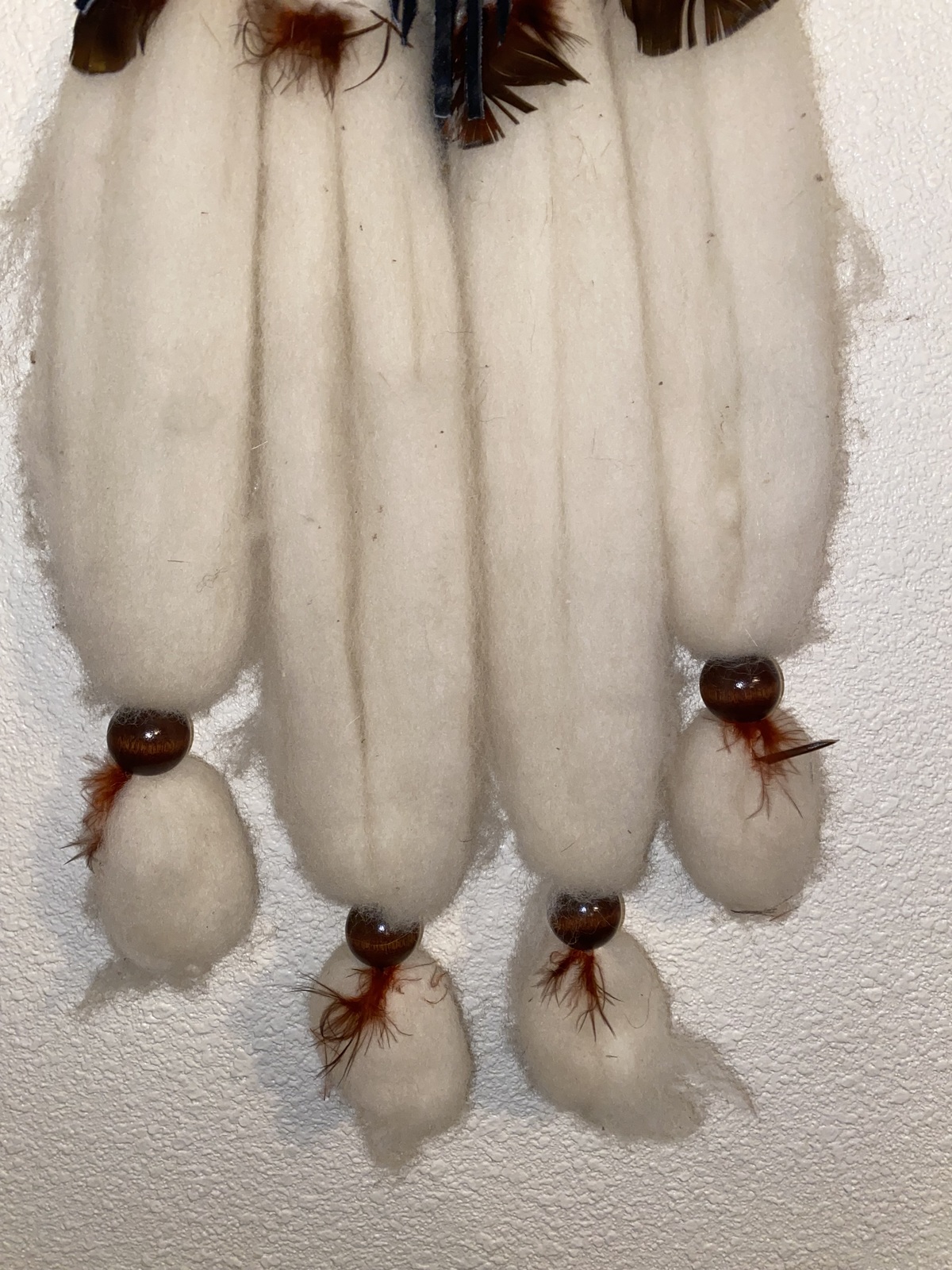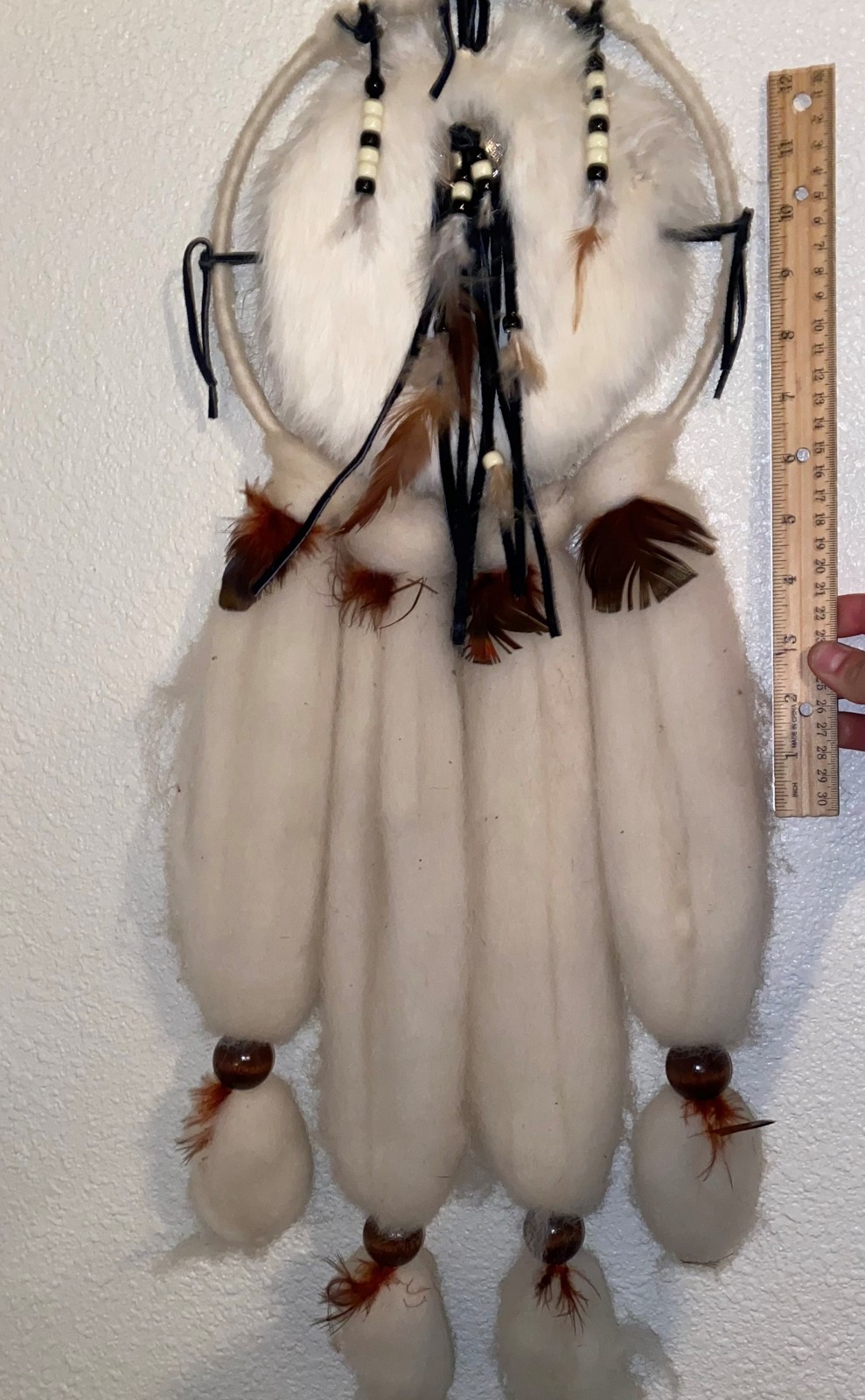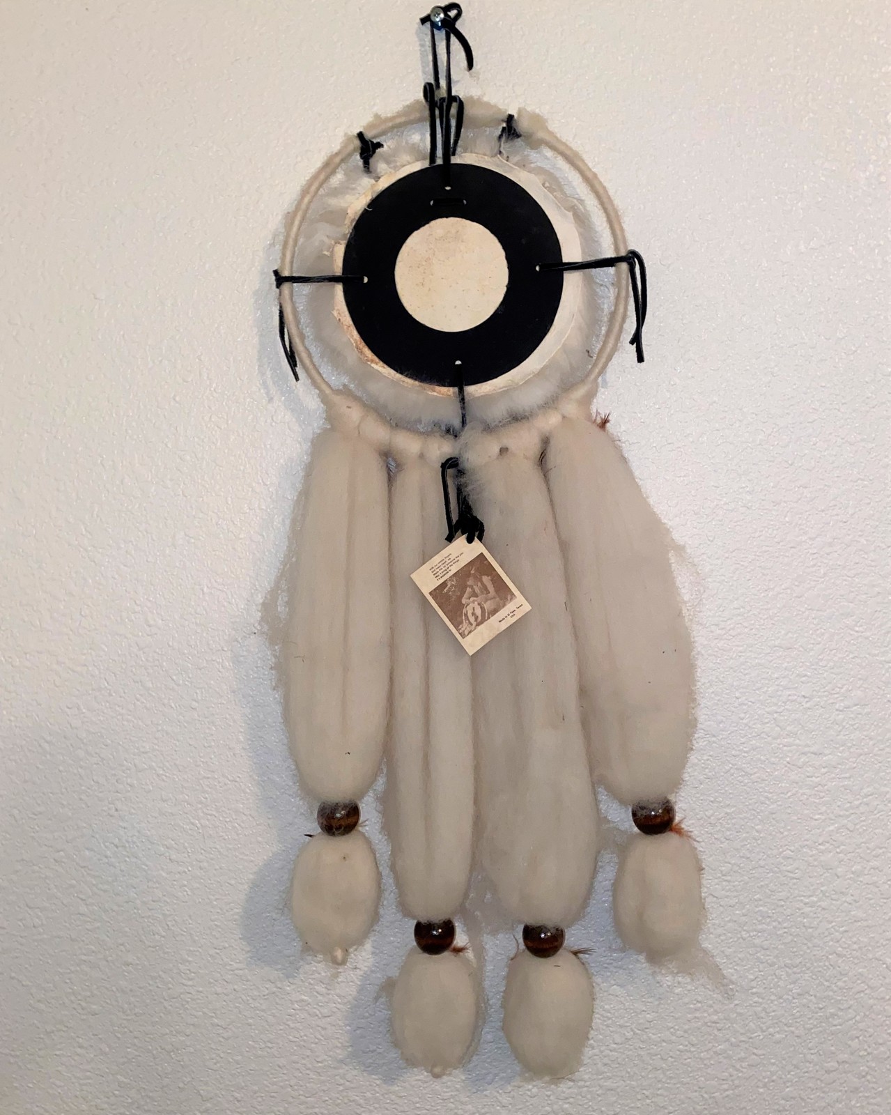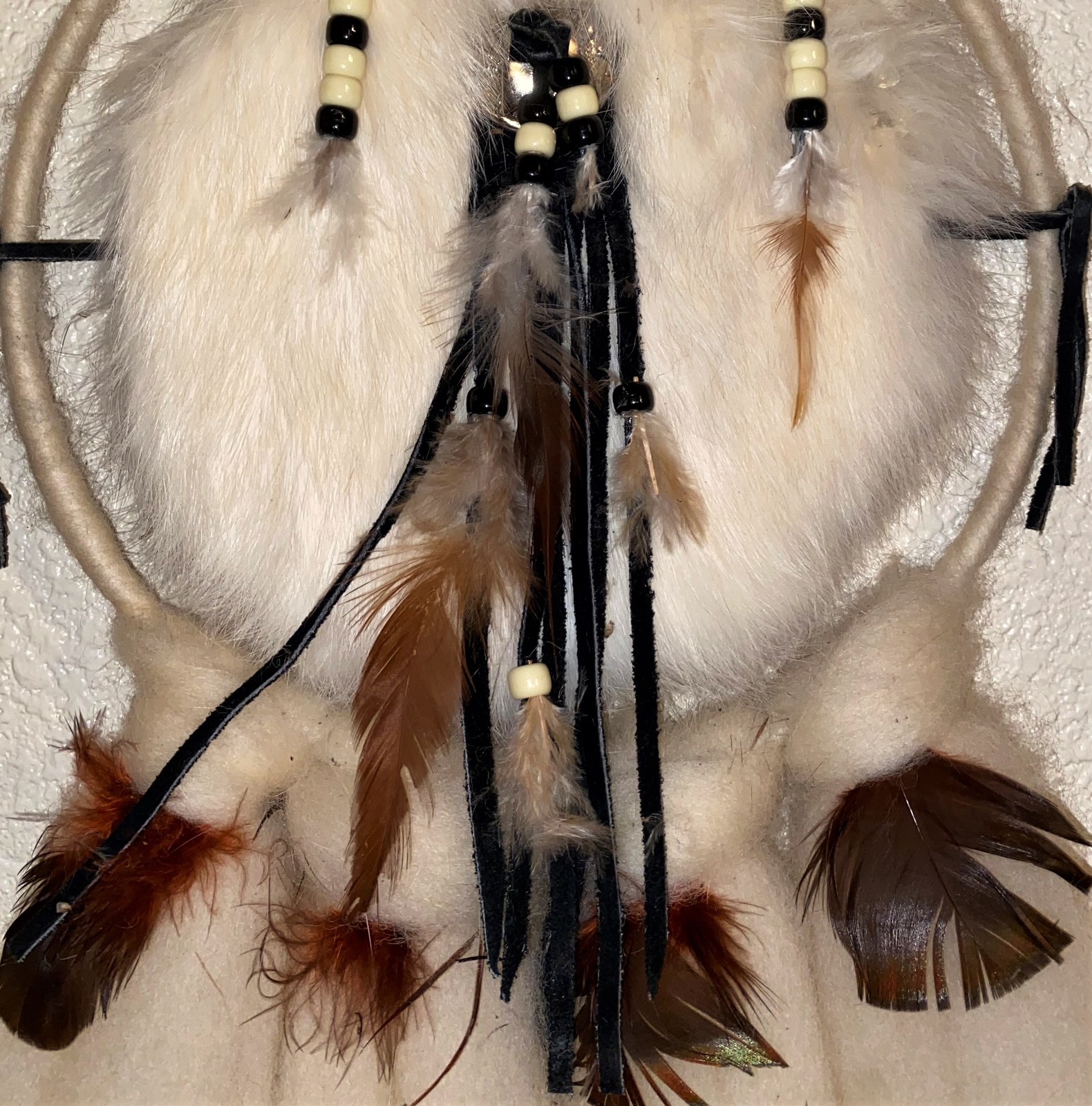 Additionally it says; This is an original handmade Indian Mandella Made from natural sheep's wool, Rabbit fur, leather, fleece and feathers of various birds.