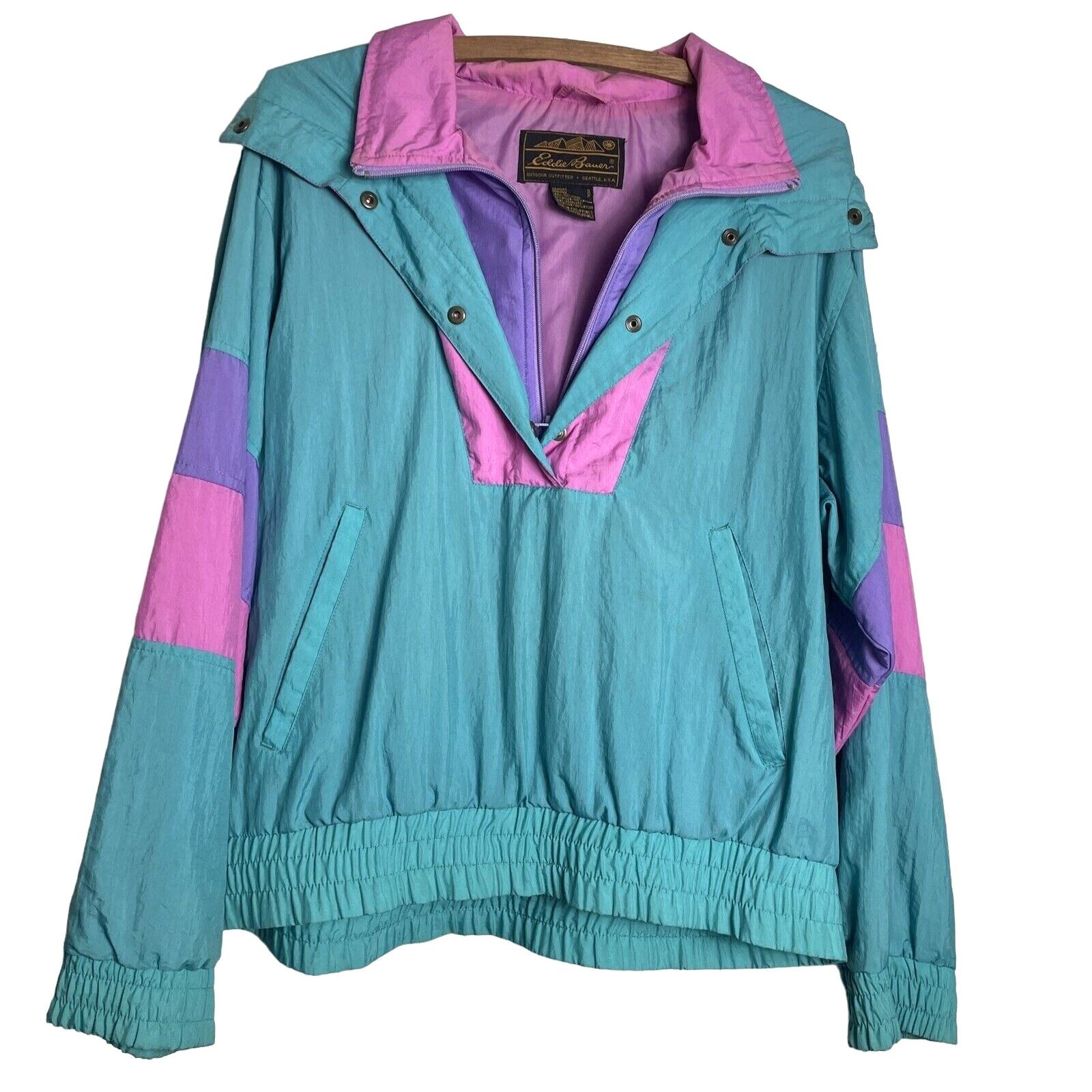 #2004. 1980s Eddie Bauer Hooded Windbreaker ? Women?s Small ? Pink, Teal, Purple ? Pullover Style. Color Block Hooded Pullover Windbreaker Jacket. 1980s Mom Core. Beautiful conditon. Please look at the pictures. Always consider offers