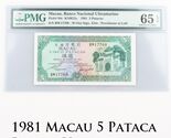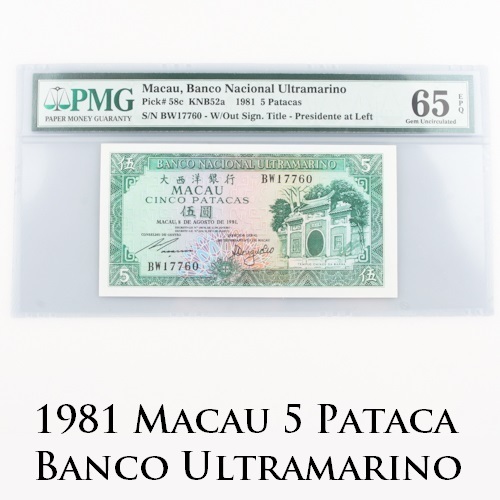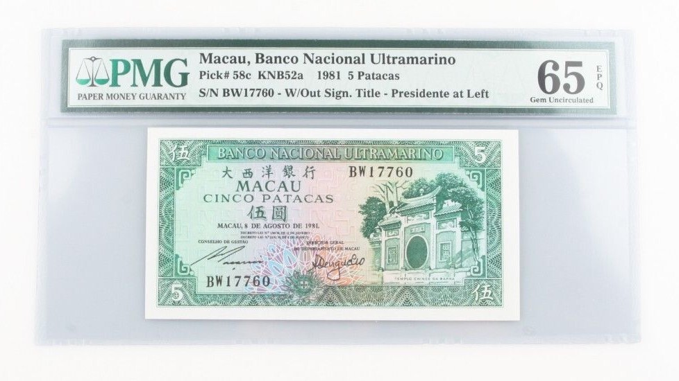 Sealed in a PMG holder with the title "Macau, Banco Nacional Ultramarino // Pick# 58c KNB52a 1981 5 Patacas // S/N BW17760 - W/Out Sign. Title - Presidente at Left"