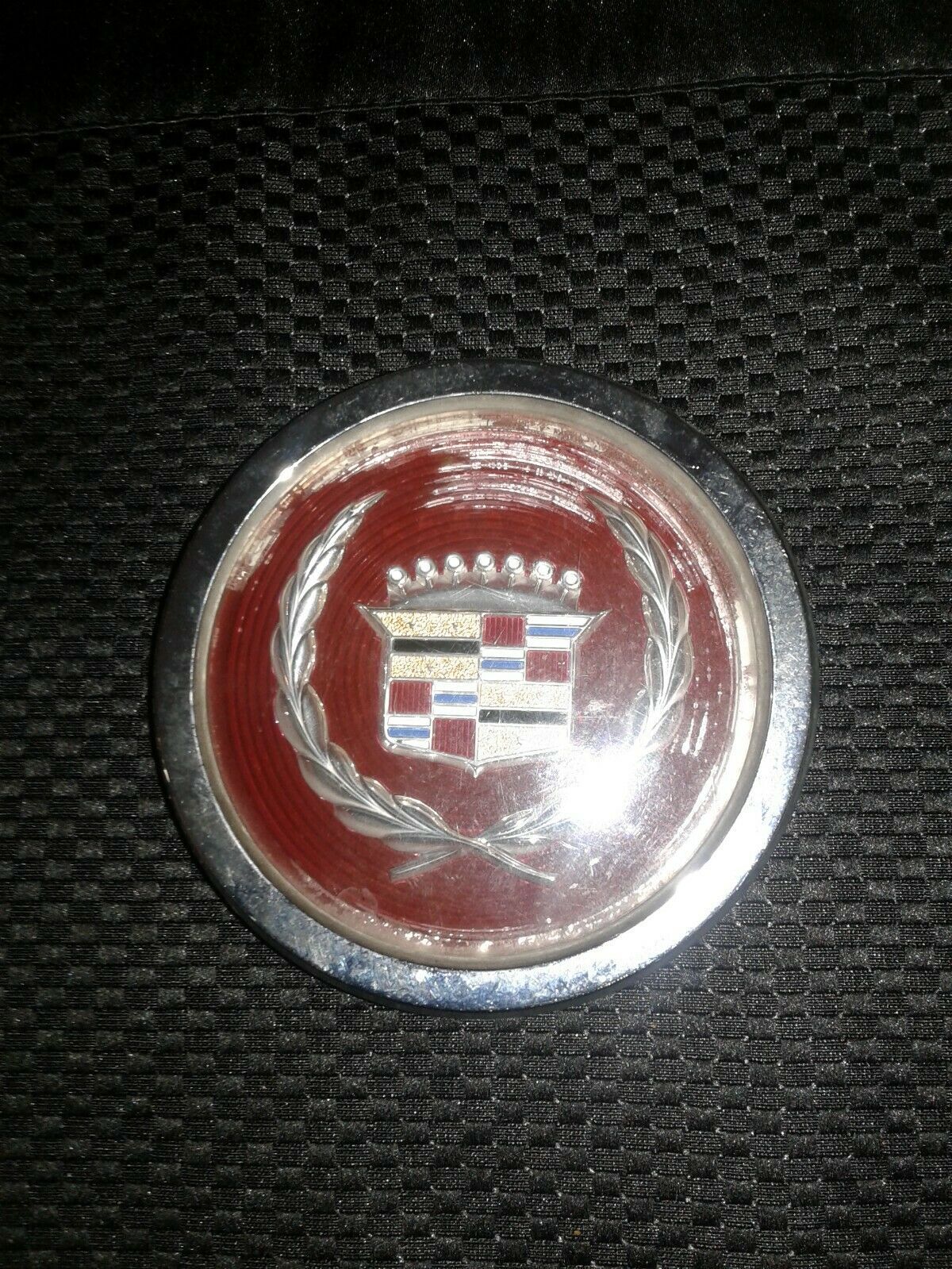 THIS CADILLAC CENTER CAP WILL FIT 1982-1992 DEVILLE FLEETWOOD.IT HAS SOME FADING ON THE BURGUNDY PART.