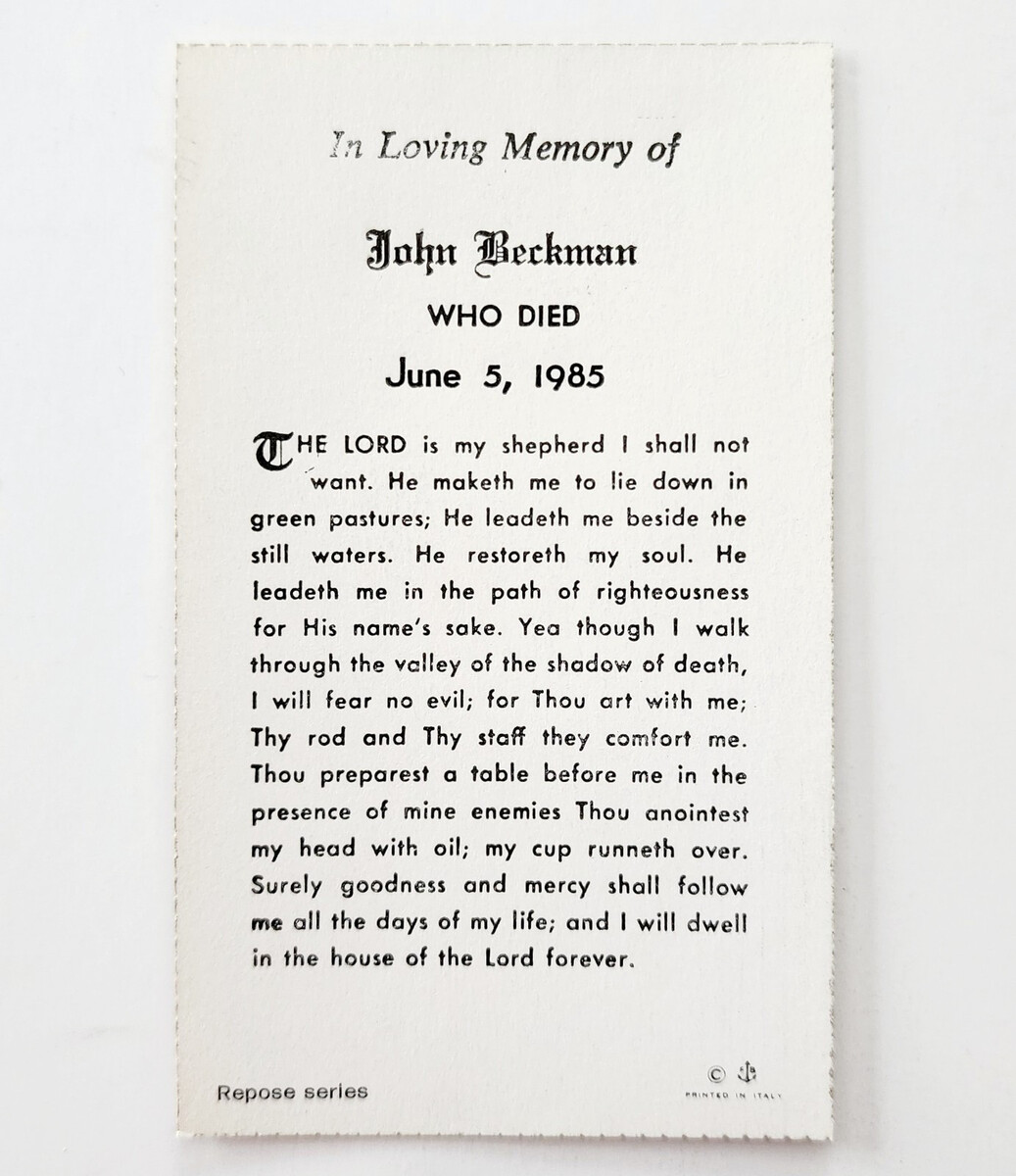 - 1985 Prayer Funeral Card John Beckman Italy Print Bible Cross Religion E10