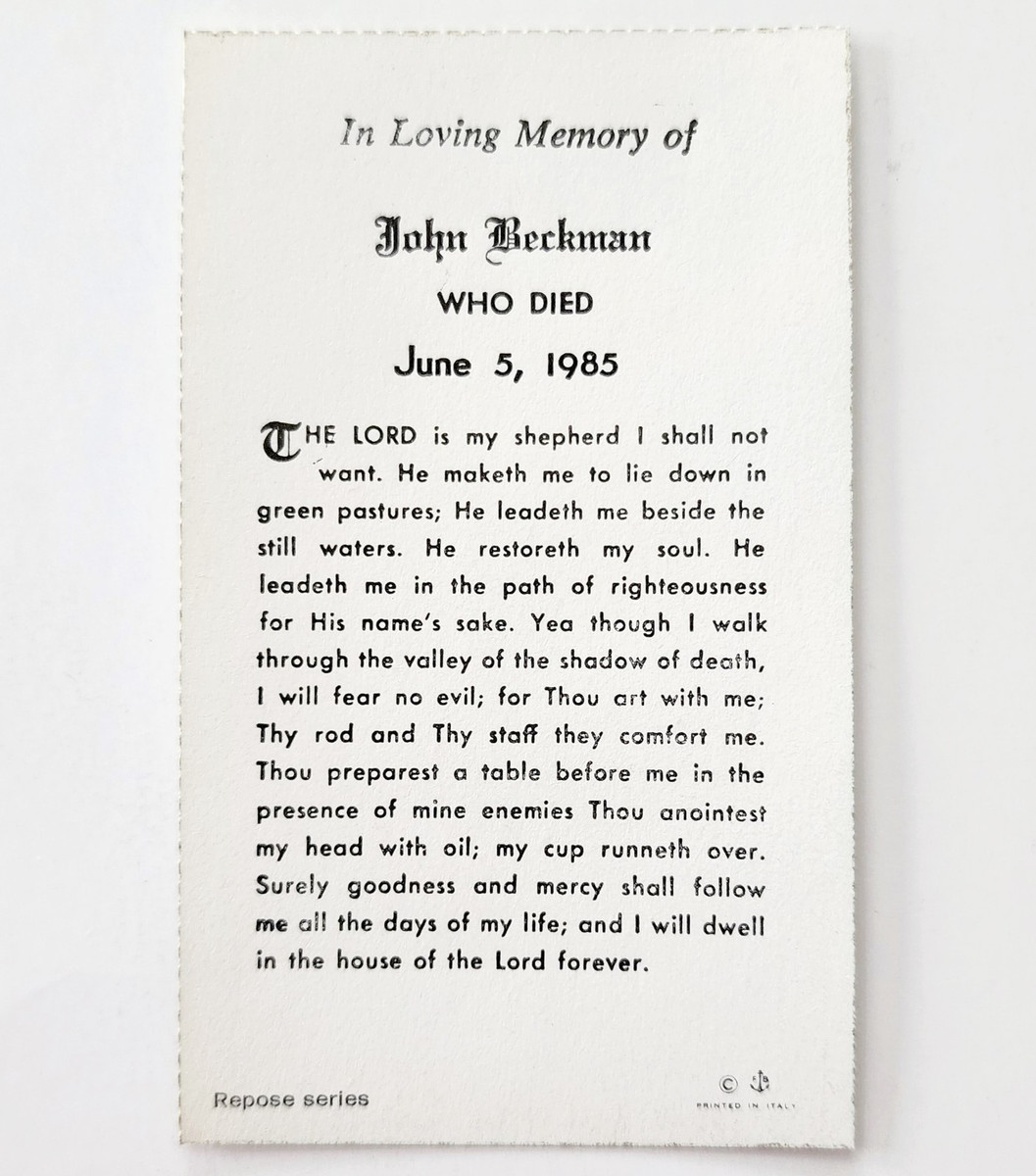 1985 Prayer Funeral Card John Beckman Italy Print Candle Cross Religion E10