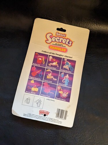 Up for sale is a new on card Sweet Secrets Dangles Baby Bottle Jolly Clown Charm by Galoob 11672. The card is creased and does not lay flad with rolled corners. There is also a punched hole below the bubble.