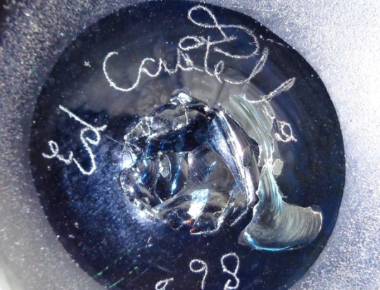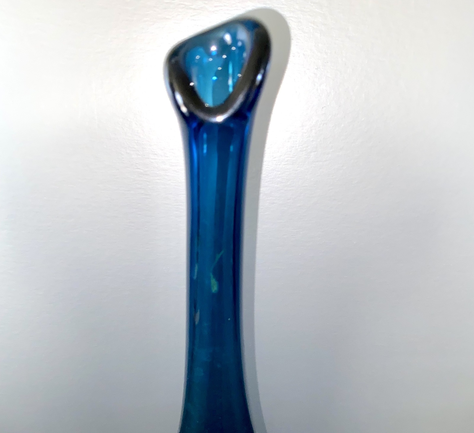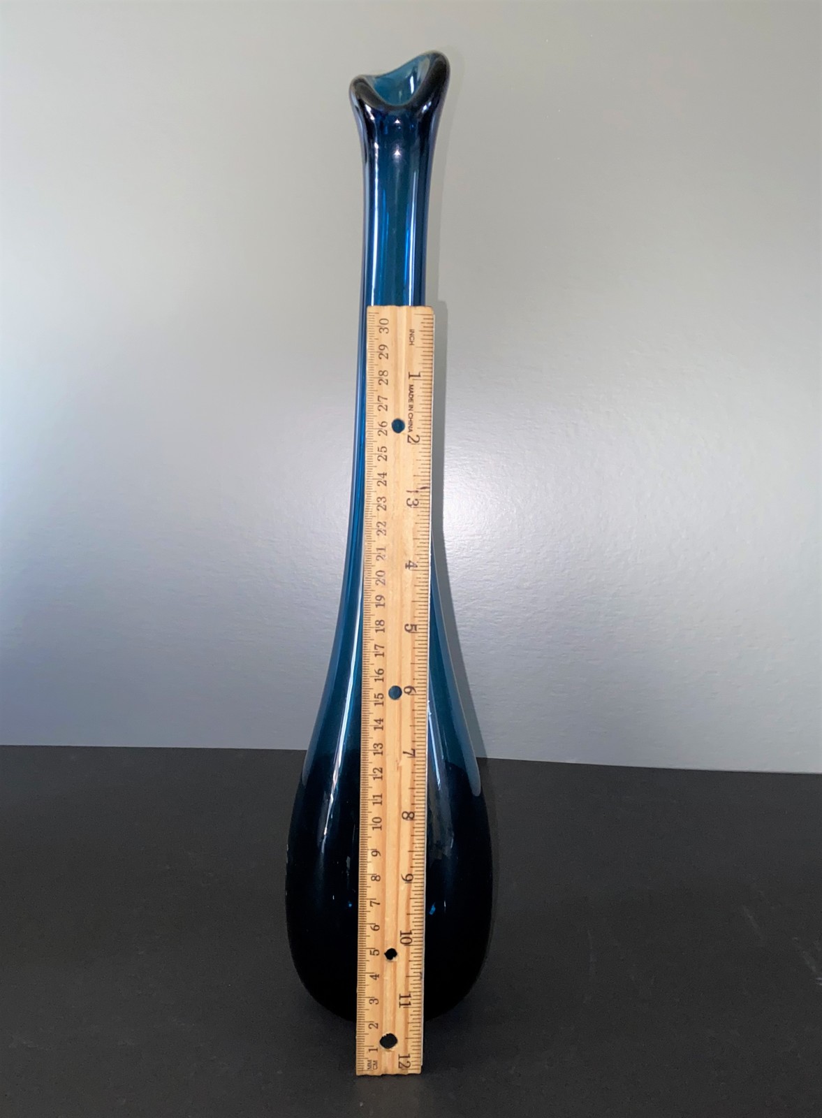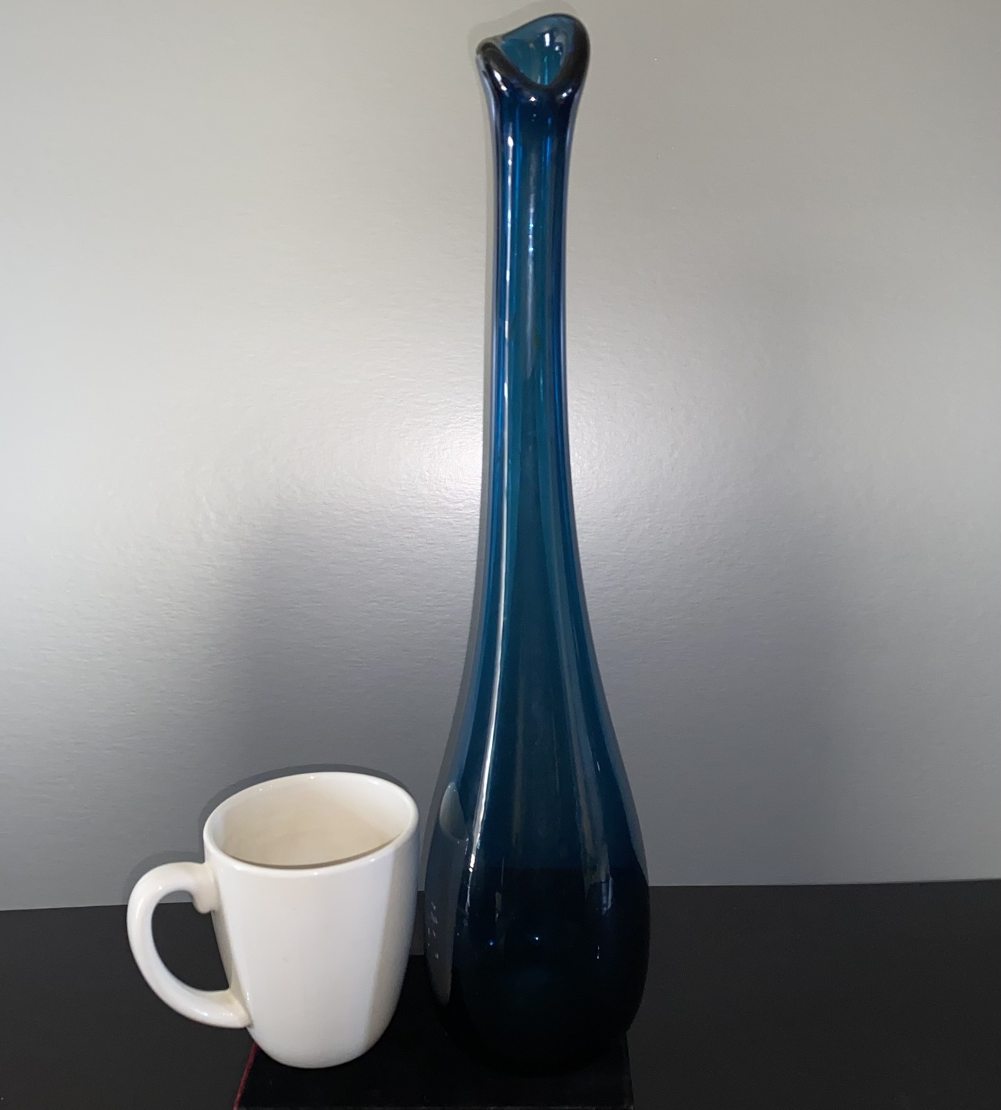 This beautiful Cobalt Vase was hand blown in 1986 by Northern California glass blowing artist Ed Castello. We actually knew Ed and his family for some time and were saddened to find out Ed passed away last year. He created some terrific pieces back in the eighties and we were fortunate to have acquired a few during the years he was in studio. This particular piece has a lovely very tall form we actually watched him create. It was quite inspiring and amazing to see Ed take molten glass and turn it into a beautiful art glass vase. Don't ever miss an opportunity to watch the glassblowing men and women at work, you too will be amazed!
