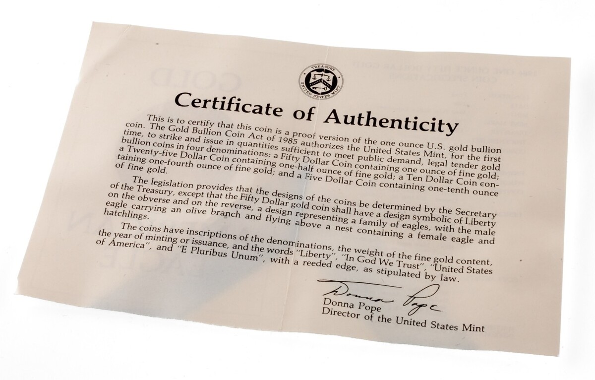 1986-W G $50 Oro American Eagle Prueba 1 Oz. Moneda W/ Ogp (Caja, COA, Funda )