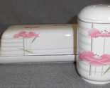 This is a Two Piece Butter Dish and Single Shaker from 1987 Sango in the Quadrille Savoir Faire Pattern. The Underplate of the Butter Dish measures approx. 8" x 4 1/2" and the Three Hole Shaker measures approx. 4" Tall and both Butter Dish and Shaker are in good condition with no flaws or damage.