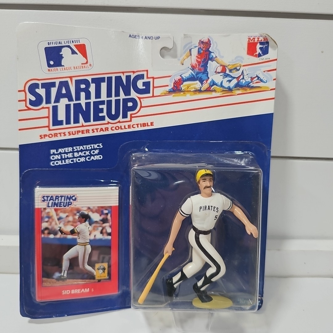 The product is a vintage 1988 Kenner action figure of Sid Bream from the Pittsburgh Pirates, part of the Starting Lineup series. This licensed reproduction figure is a collectible item featuring the baseball character in his rookie year. Perfect for fans of the sport and collectors of vintage toys, this item captures a piece of baseball history with its nostalgic design and theme.
