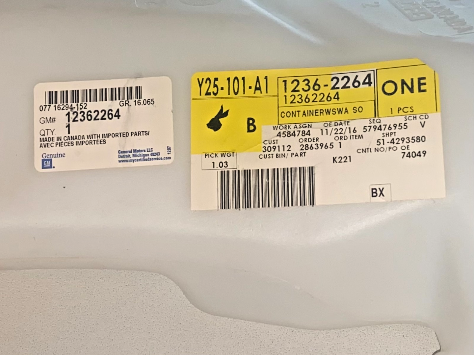 1990-2005 GENUINE GM WINDSHIELD WASHER SOLVENT TANK, PART NUMBER 12362264