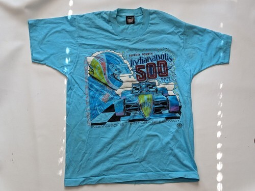 Up for sale is used with blemishes 1990 Indianapolis 500 Speedway T Shirt Blue Screen Star 50 50 USA Luyendyk in size Large.
