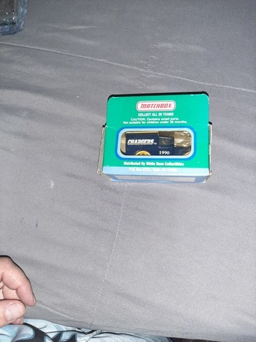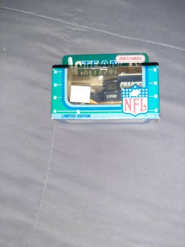 1990 San Diego Chargers Matchbox NFL Model A FORD. The packaging shows a lot of shelf wear.
