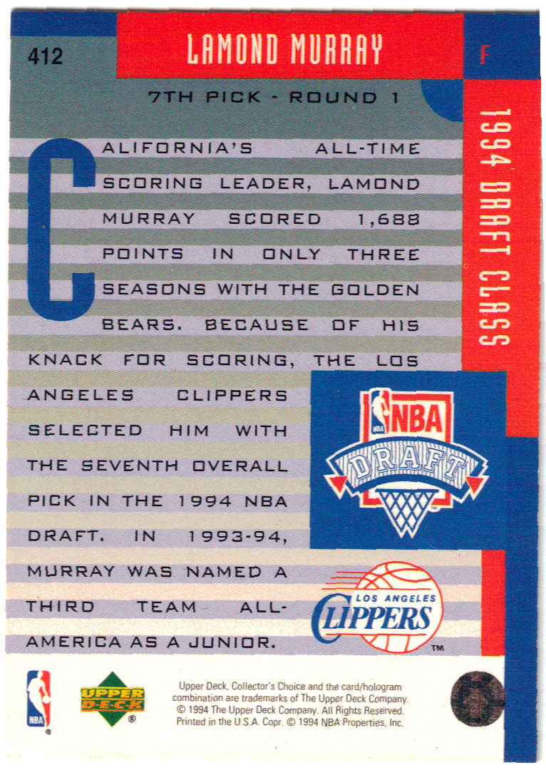- 1994-1995 Upper Deck Collector's Choice Card Lamond Murray #412 LA Clippers NBA