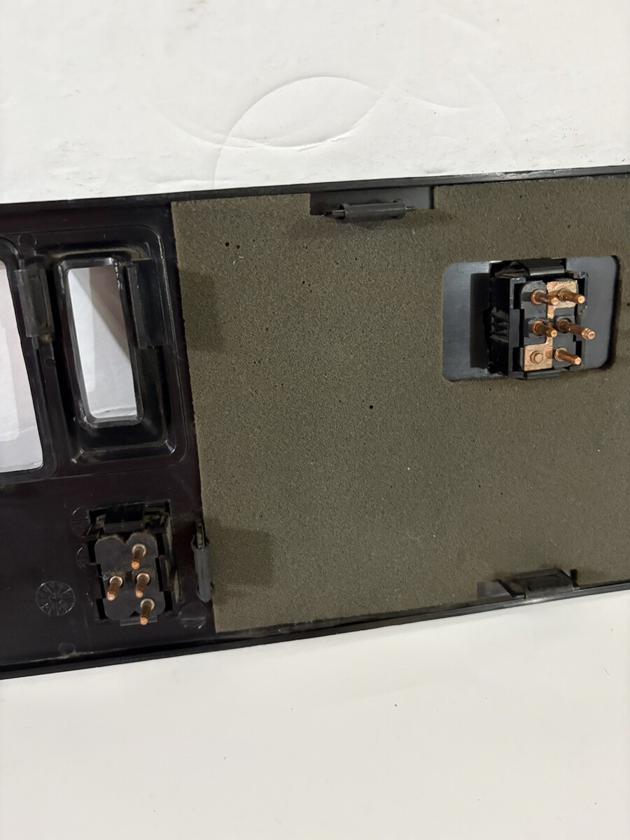 Used OEM door switch bezel from a 1995 GMC Safari. Normal wear from age, light scratches, and signs of use but no cracks, broken tabs, or functional issues. All mounting points and switch openings are intact.