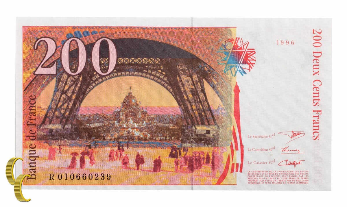 1996 France 200 Francs (VF+) Very Fine Plus Condition 1996 France 200 Francs Serial #R010660239 Pick #159a Condition ungraded: expected to grade Very Fine Plus, (VF+) if evaluated by a reputable grading company Visit Our Store: Continental Coin and Jewelry All items are professionally packaged and shipped. All shipments include insurance and delivery confirmation or signature confirmation. Local Pick-up is available in our showroom. (Contact us for payment methods to pay on pickup.) All international packages will have the required customs declaration and value of order. California Buyers: Returns Policy: Your continuing satisfaction is very important to us. We offer a 30 day money back return policy. If you are unhappy with your purchase for any reason, please notify us so tha