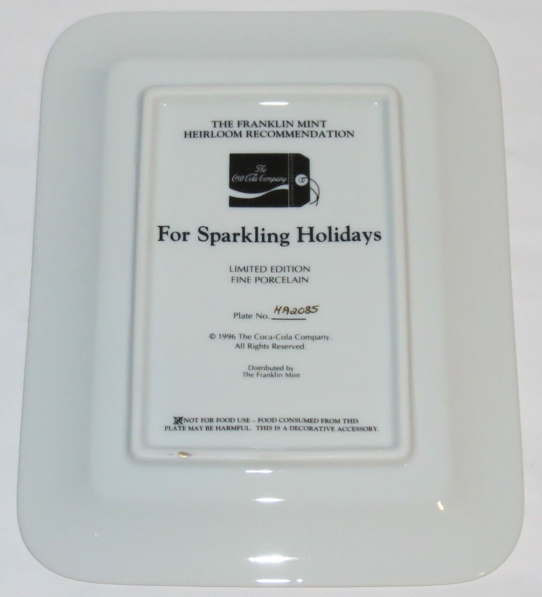 This 1996 Franklin Mint "For Sparkling Holidays" rectangular collector plate is a vintage decorative collectible featuring a