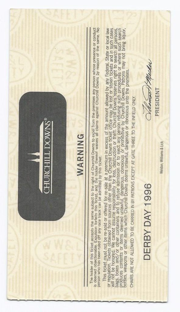 For Sale is a rare and hard to find vintage 1996 Kentucky Derby Ticket stub. its In good USED Condition as pictured. no rips tears or writing just some minor handling wear. would make a wonderful additioon to any collection. Please ask Any and All Questions prior to purchasing. Fast Same or Next day shipping with Free Delivery Confirmation within the U.S. Payment Due within 7 days of purchase (if you need more time please let us know In advance) we love to combine shipping is always a Yes and Most of the time Additional Items Ship for free.