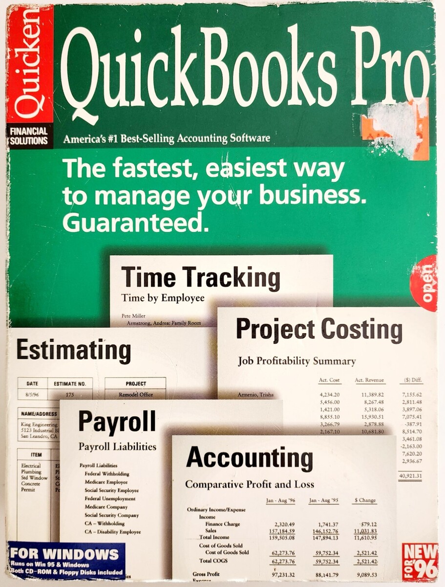 - 1996 QuickBooks Pro Floppy CD-ROM Open Box Unused Vintage Finance Software ELEC