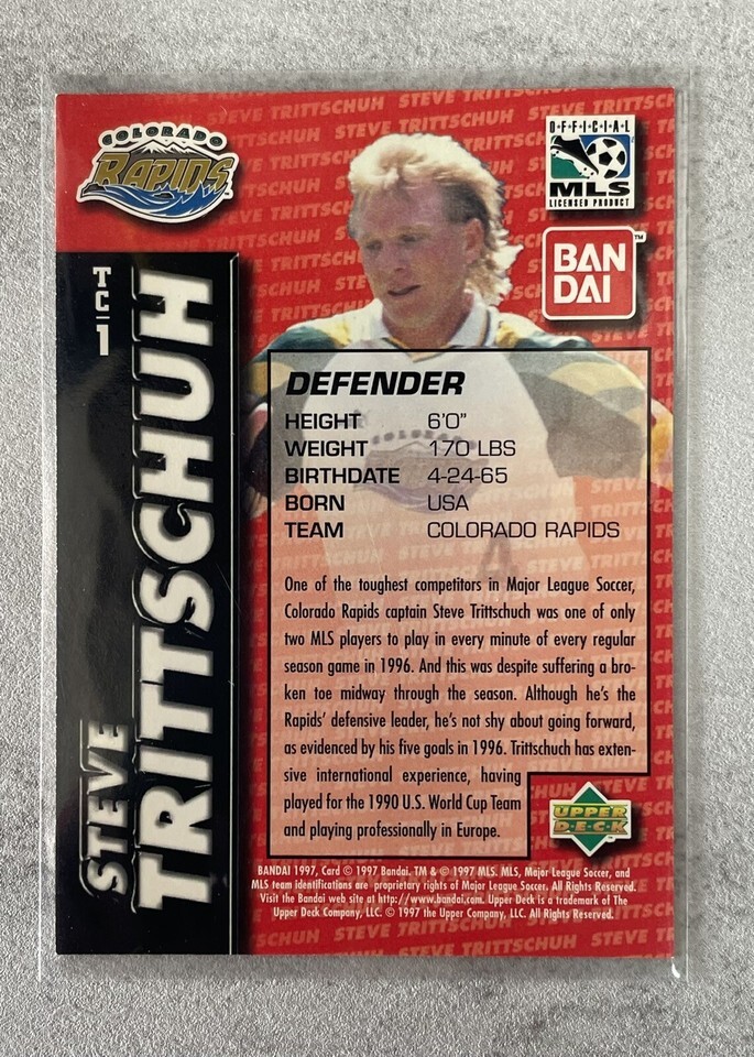 This 1997 Upper Deck Bandai MLS Team Captain trading card features Steve Trittschuh, the former Colorado Rapids player and soccer legend. It is a single-insert original from Upper Deck with the card number TC1. This authentic card is a valuable addition to any sports collection. Don't miss owning this rare piece of soccer history!