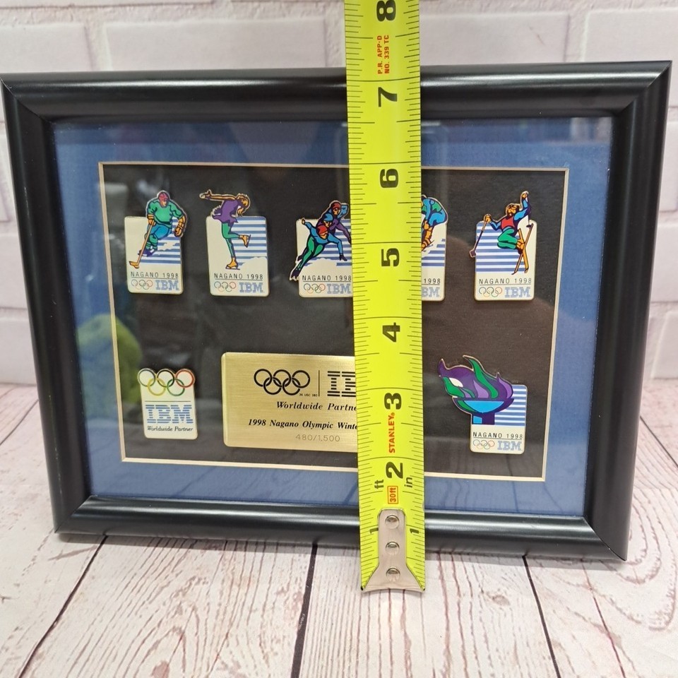 The 1998 IBM Nagano Olympic Winter Games 7-Pin Framed Set is a limited edition vintage collection of Olympic memorabilia. This original set captures the spirit of the 1998 Winter Olympics, making it a unique and valuable piece for sports enthusiasts and collectors alike. Each pin represents a specific event or moment from the games, making it a special addition to any sports memorabilia collection.