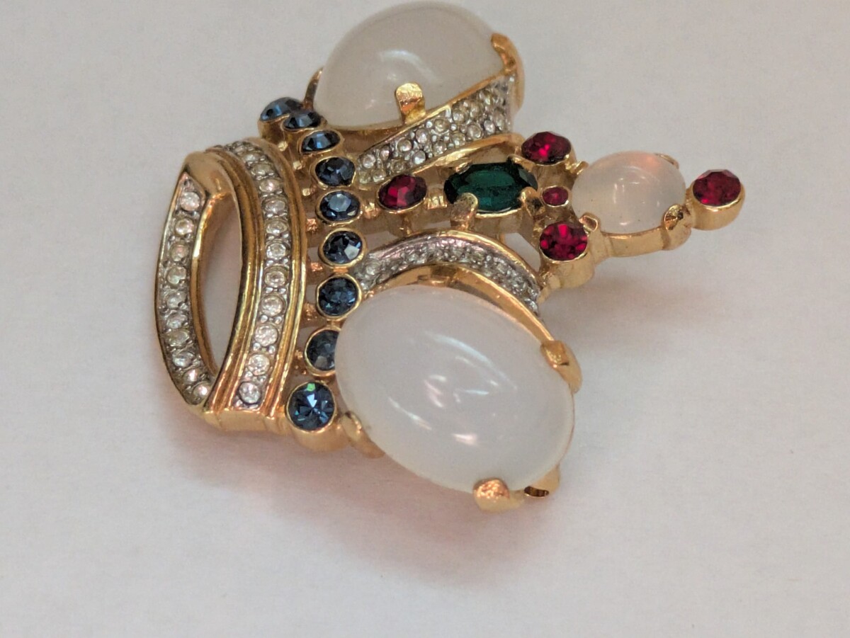 Die 1998 Trifari Alfred Philippe Crown Brosche mit Mondsteinjuwel ist ein Vintage-Schmuckstück der renommierten Marke Trifari. Diese originelle Brosche verfügt über ein mehrfarbiges Design mit einem roten Cabochon-Mondstein in Messingfassung, was sie zu einem einzigartigen und eleganten Accessoire für Frauen macht. Dieses in den USA hergestellte Vintage-Stück verleiht jedem Outfit einen Hauch von Nostalgie und Raffinesse und ist somit eine zeitlose Erganzung jeder Schmuckkollektion.