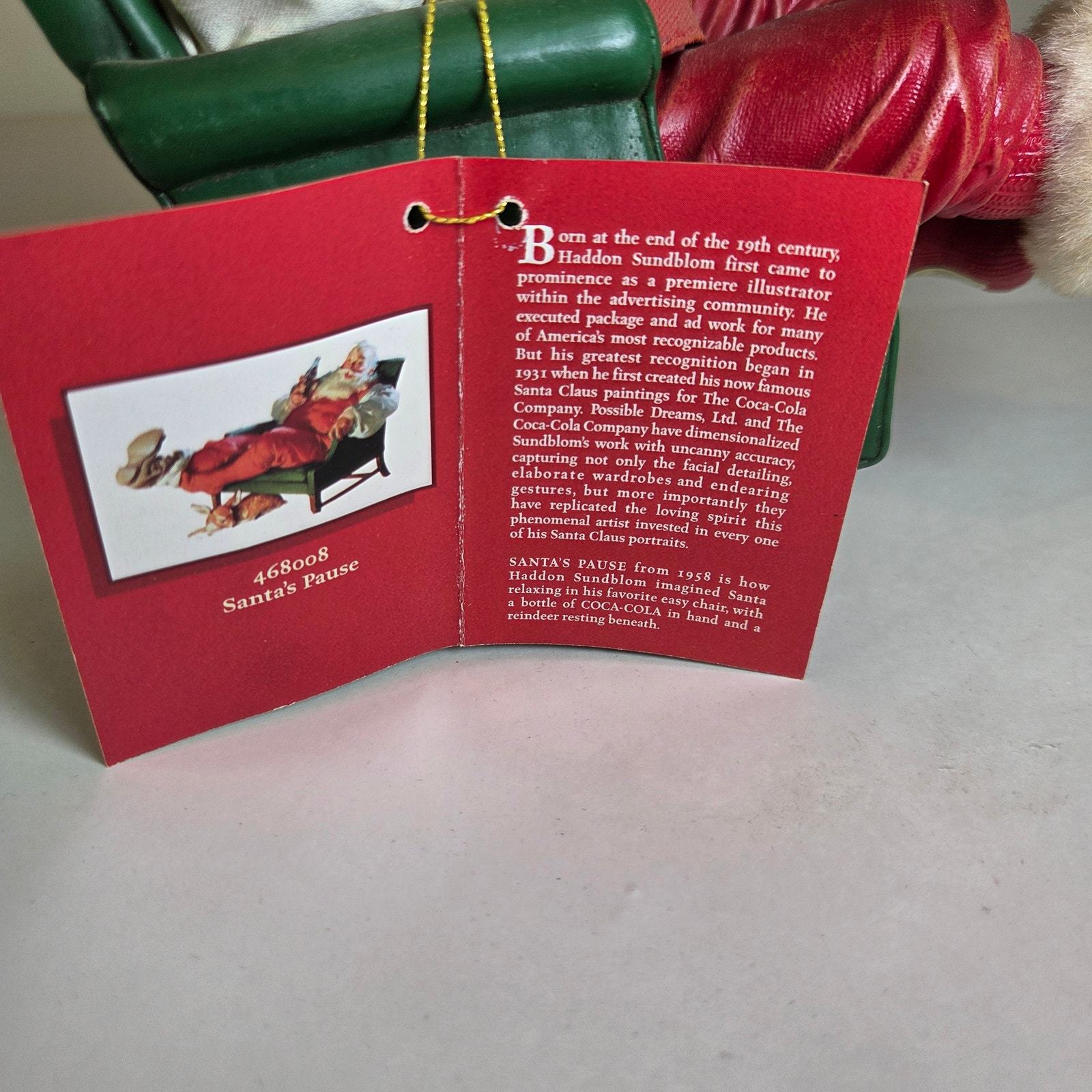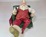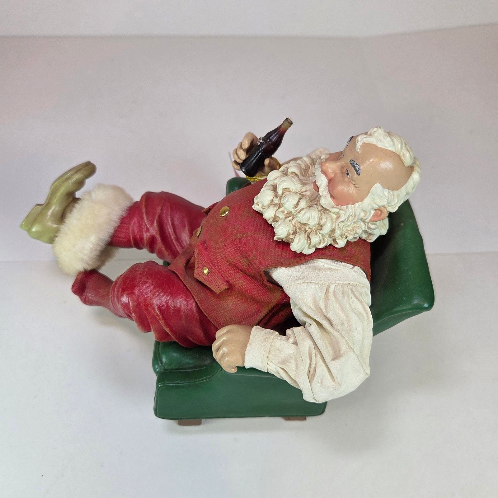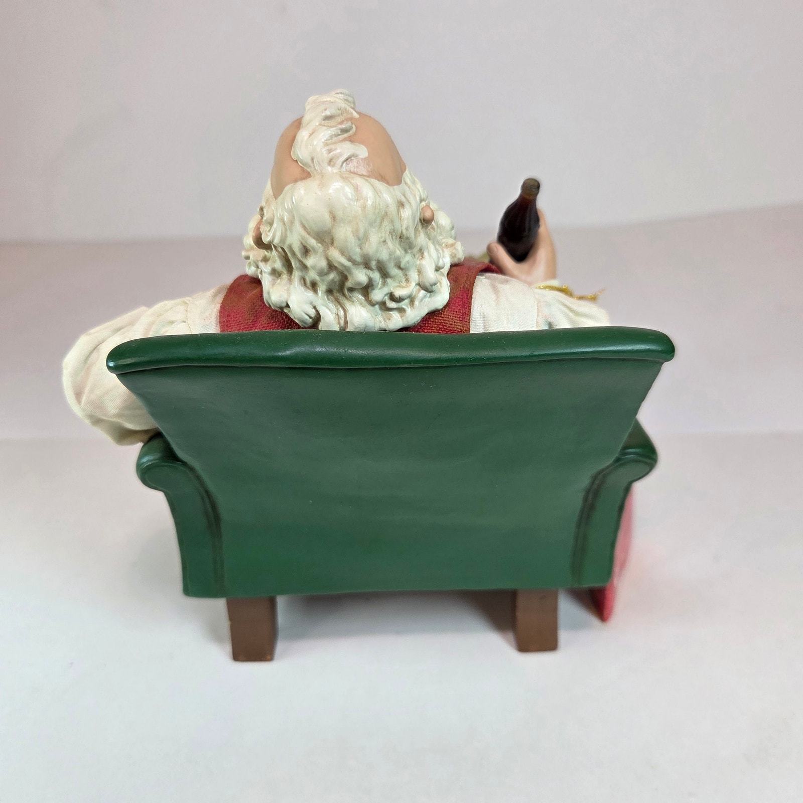 This vintage 1999 Coca-Cola Clothtique Santa figurine by Possible Dreams is titled ?Santa?s Pause.? It depicts Santa relaxing in a green armchair with a Coca-Cola bottle in hand, a design based on Haddon Sundblom?s 1958 Coca-Cola Santa artwork.