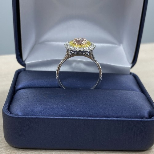 Dieser wunderschone Verlobungsring zeigt einen atemberaubenden 1-Karat-Diamanten, der von Labor ausgebrilligtem, lebhaftem, labendem Labor gewachsen ist, das von einem doppelten Halo eingerahmt ist-der erste in 18 Karat Gelbgold mit gelben Diamanten und das zweite in 14 Karat Weißgold mit weißen Diamanten für einen auffalligen Kontrast. Die Brillanz setzt sich mit Diamonds fort, die die Band und unter der Galerie kaskadieren und ein exquisites und kompliziertes Design erzeugen, das Eleganz aus jedem Winkel ausstrahlt.#